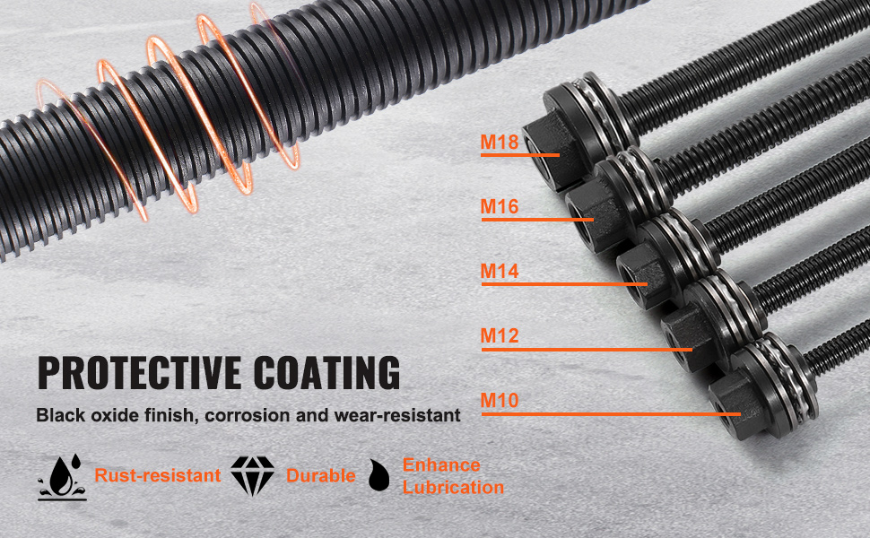 Ťahacie vretená sú vybavené ochrannou vrstvou z čierneho oxidu, ktorá odoláva korózii, opotrebovaniu a hrdzi, čím sa predlžuje životnosť náradia. To tiež zlepšuje mazanie, znižuje trenie a zvyšuje účinnosť, čím sa zabezpečuje hladká a spoľahlivá prevádzka sťahovacích vretien.