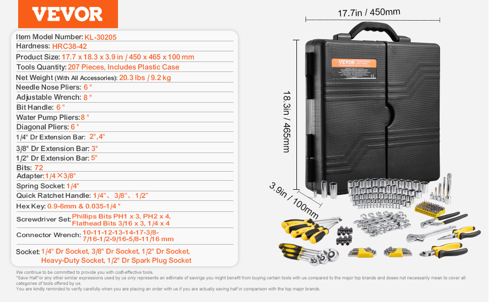Súprava mechanického náradia s 207 dielmi obsahuje nástrčné hlavice s jasne označenými veľkosťami, ktoré vám umožnia ľahko nájsť správny nástroj na danú prácu, a to aj pri slabom osvetlení.