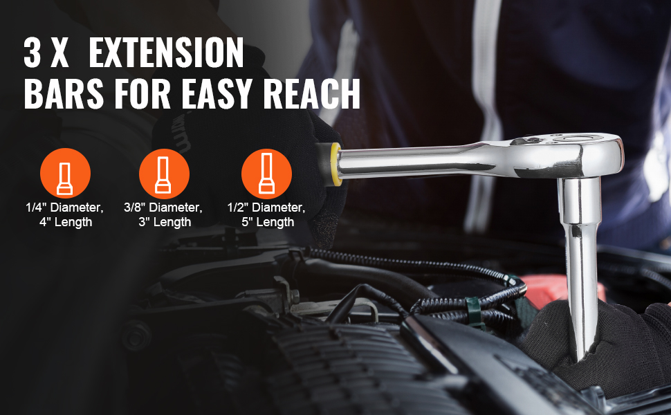Či už pracujete v úzkych rohoch alebo hlbokých výklenkoch, predlžovacia lišta súpravy mechanického náradia je navrhnutá tak, aby vyhovovala vašim potrebám. Rýchlo a bezpečne ju pripevnite k rukoväti, aby ste mohli efektívne pracovať.