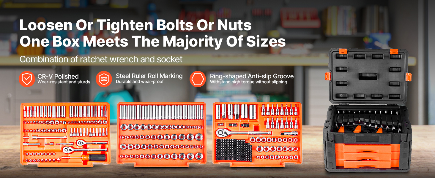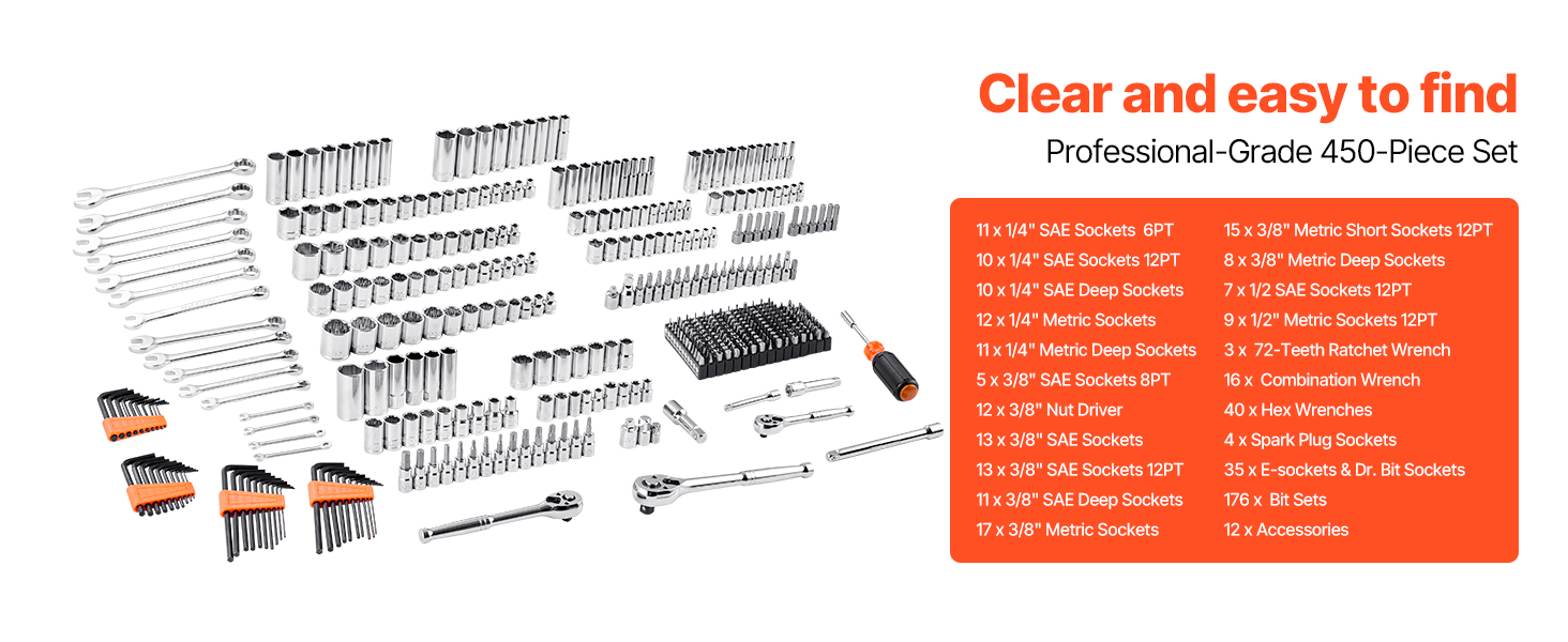 Táto 450-dielna súprava mechanického náradia je jasne označená na rýchlu identifikáciu veľkosti nástrčiek. Je navrhnutá tak, aby zvládla všetko od domácich opráv až po profesionálne práce, a pomôže vám ušetriť čas a pracovať efektívnejšie.