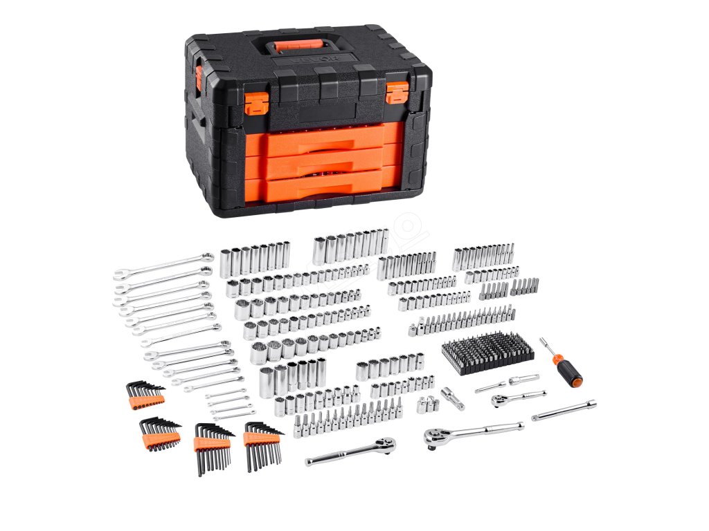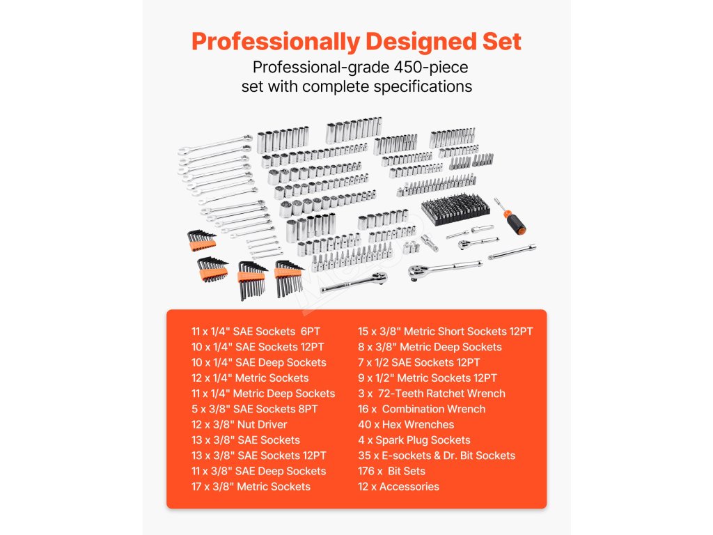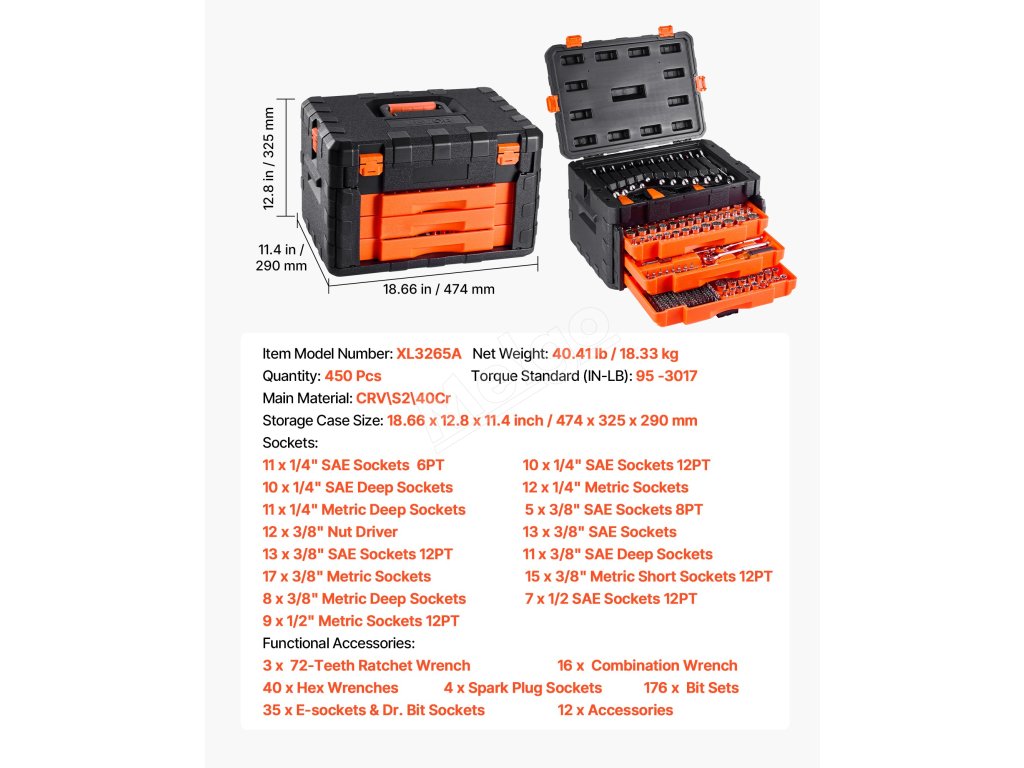 Táto 450-dielna súprava mechanického náradia je jasne označená na rýchlu identifikáciu veľkosti nástrčiek. Je navrhnutá tak, aby zvládla všetko od domácich opráv až po profesionálne práce, a pomôže vám ušetriť čas a pracovať efektívnejšie.