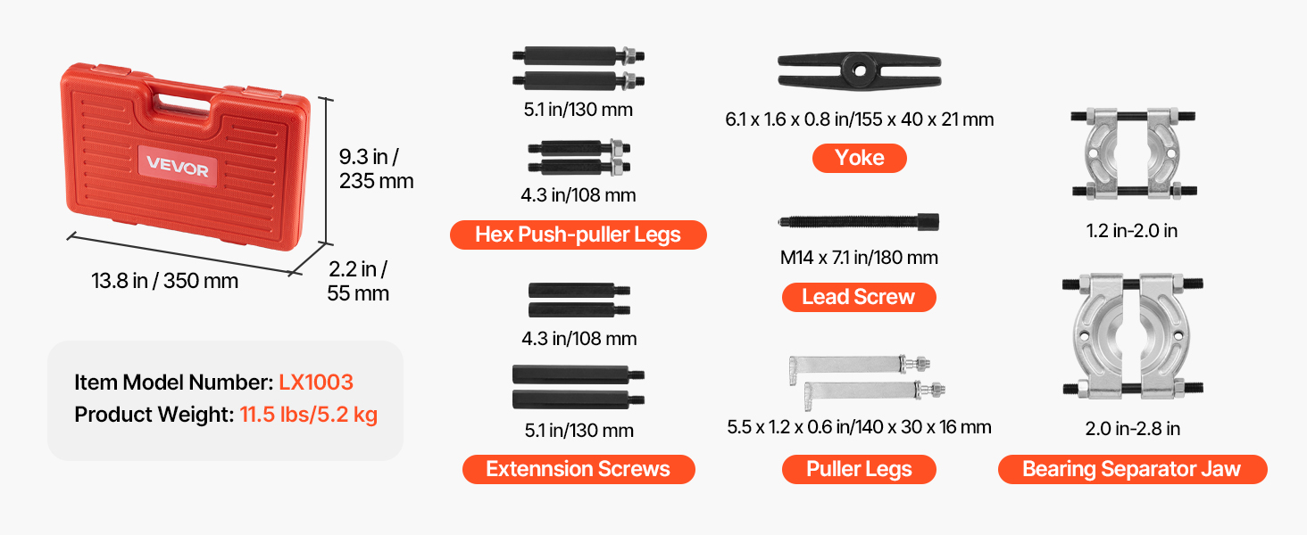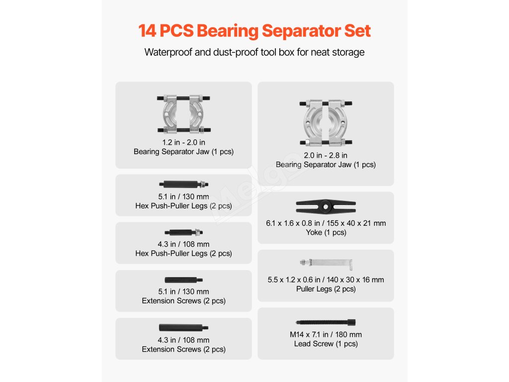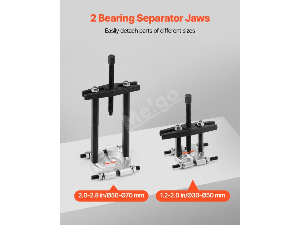 Naša súprava sťahováka ložísk obsahuje dve oddeľovacie čeľuste s nastaviteľnou veľkosťou, predlžovacie skrutky a nohy sťahováka. Sťahovák môžete zostaviť na základe svojich konkrétnych potrieb, či už ide o horizontálne alebo vertikálne sťahovanie automobilových ložísk, ozubených kolies, remeníc alebo univerzálnych kolies.