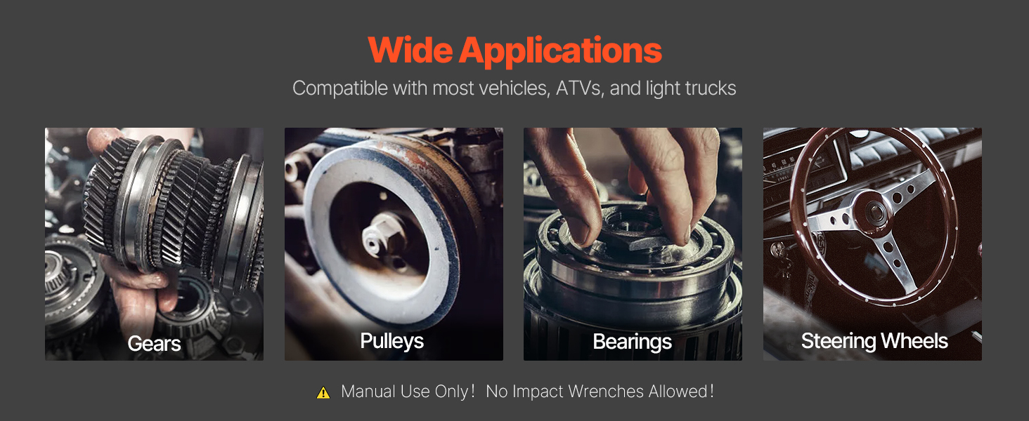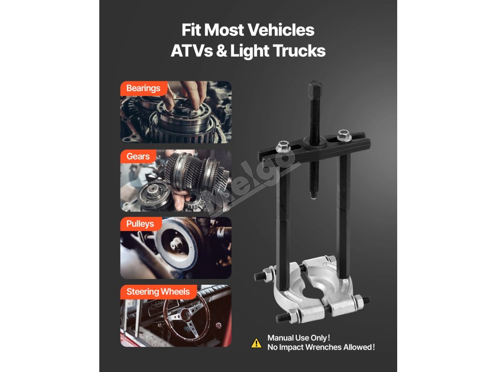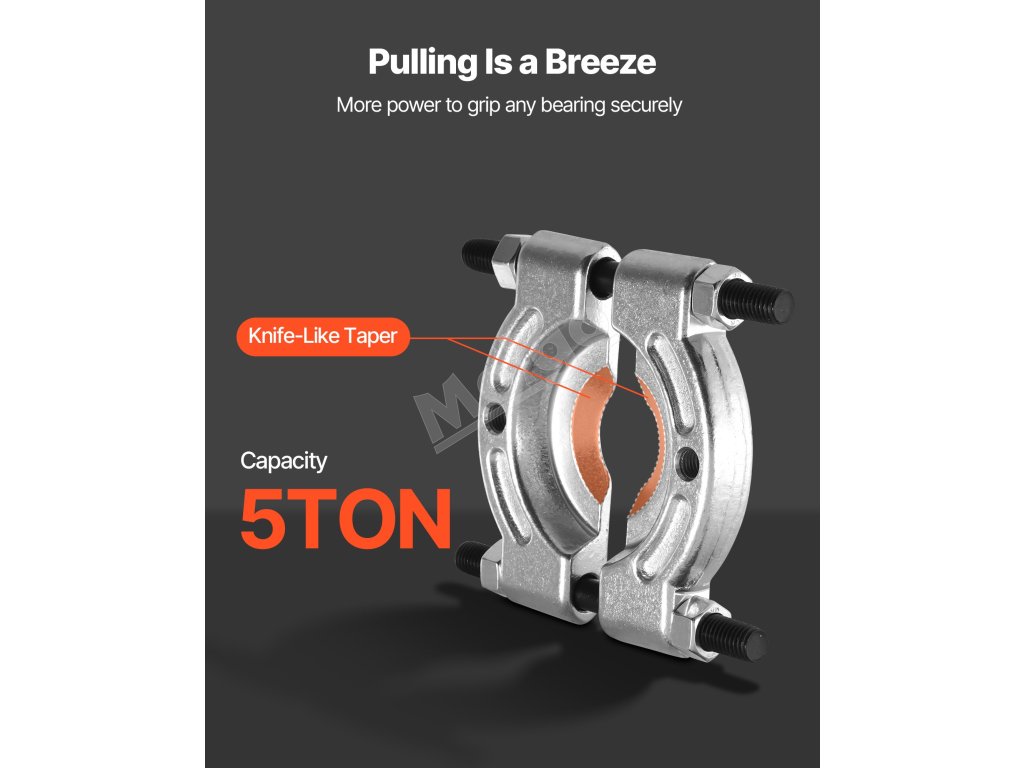 Táto sada sťahovákov na ložiská v tvare kolieska, určená pre väčšinu vozidiel, obsahuje dve veľkosti na ložiská, remenice, prevodovky a volanty. Poskytuje ťahovú silu 5 T bez poškodenia vnútorných častí. Je vyrobený z nehrdzavejúcej ocele vysokej pevnosti - odoláva nárazom a korózii oleja pre dlhodobé používanie.