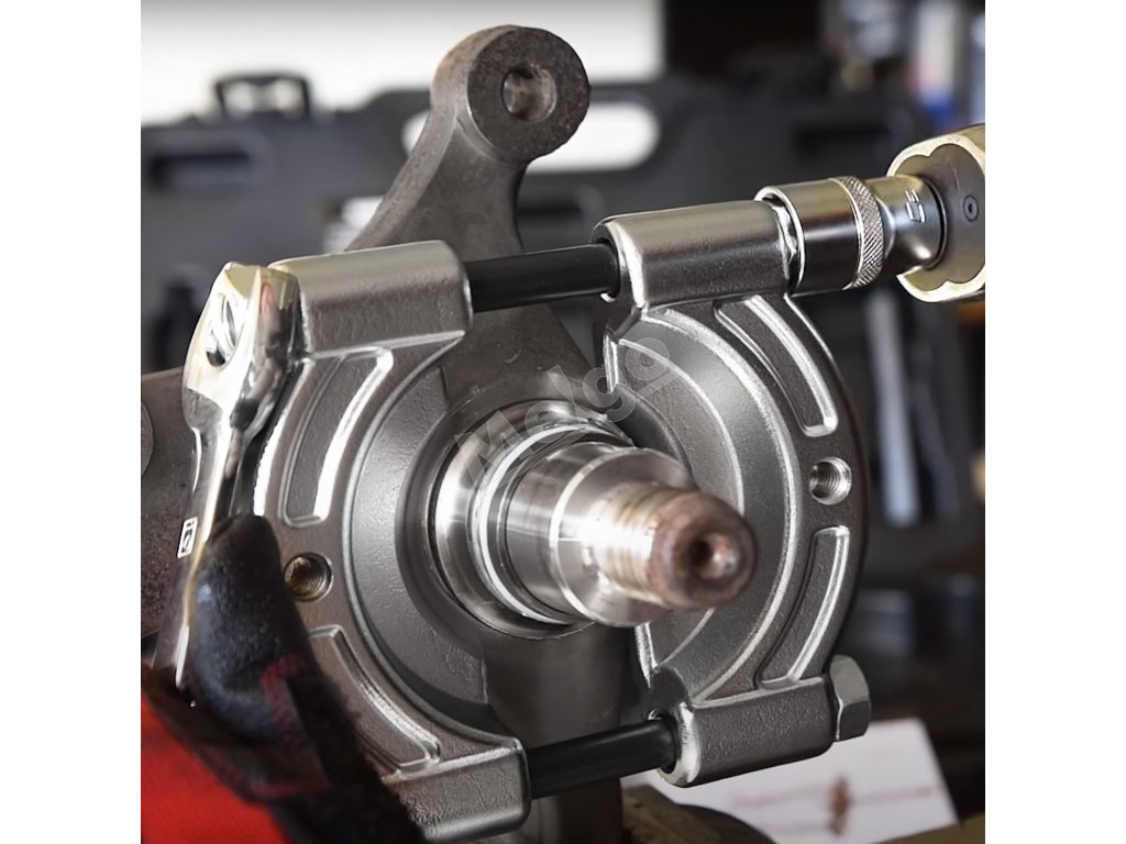 Naša súprava sťahovákov dokáže vyvinúť maximálne napätie 5 ton. Jeho nožová konštrukcia umožňuje dosiahnuť hlboko do medzery ložiska, čím sa zabezpečí jeho presné uchytenie a účinne sa zabráni uvoľneniu ložiska počas demontáže.