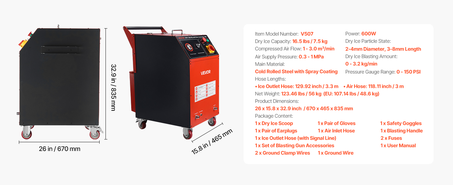 Vyžaduje externý vzduchový kompresor s vonkajším priemerom > DN20 a menovitým tlakom > 6 barov. Kapacita suchého ľadu: 16,5 lbs (7,5 kg), prietok stlačeného vzduchu: 1 - 3,0 m³/min, stav častíc suchého ľadu: priemer 2-4 mm, dĺžka 3-8 mm, tlak dodávaného vzduchu: 0,3 - 1 MPa, množstvo suchého ľadu na otryskávanie: 0 - 3,2 kg/min.