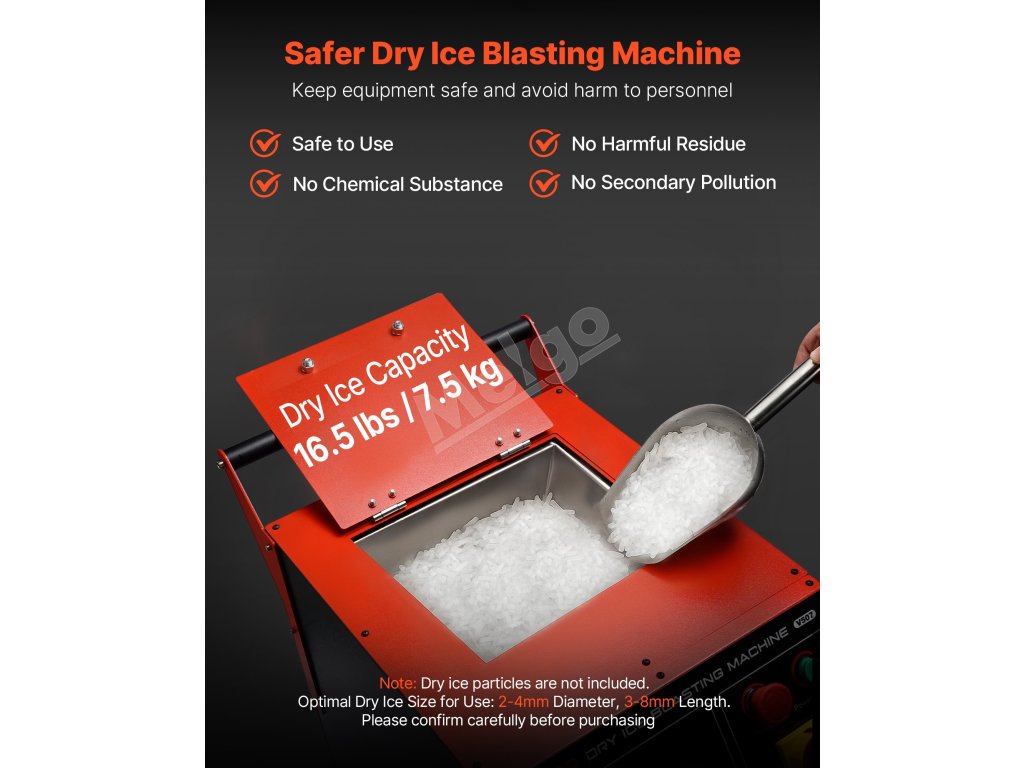 Vyžaduje externý vzduchový kompresor s vonkajším priemerom > DN20 a menovitým tlakom > 6 barov. Kapacita suchého ľadu: 16,5 lbs (7,5 kg), prietok stlačeného vzduchu: 1 - 3,0 m³/min, stav častíc suchého ľadu: priemer 2-4 mm, dĺžka 3-8 mm, tlak dodávaného vzduchu: 0,3 - 1 MPa, množstvo suchého ľadu na otryskávanie: 0 - 3,2 kg/min.