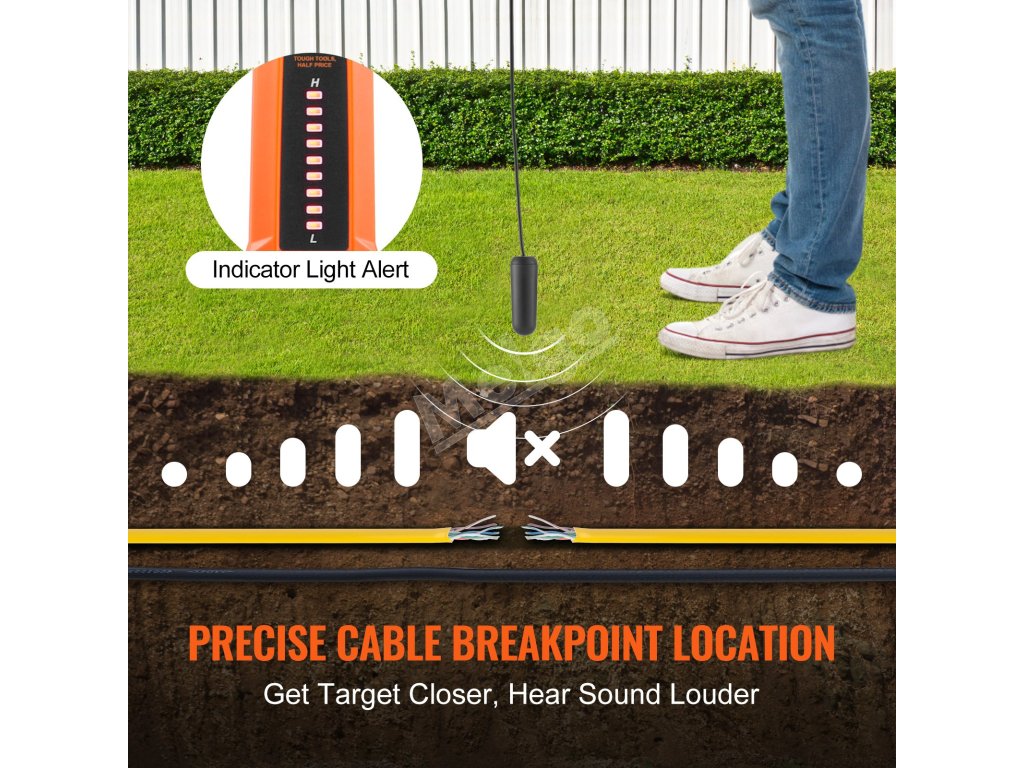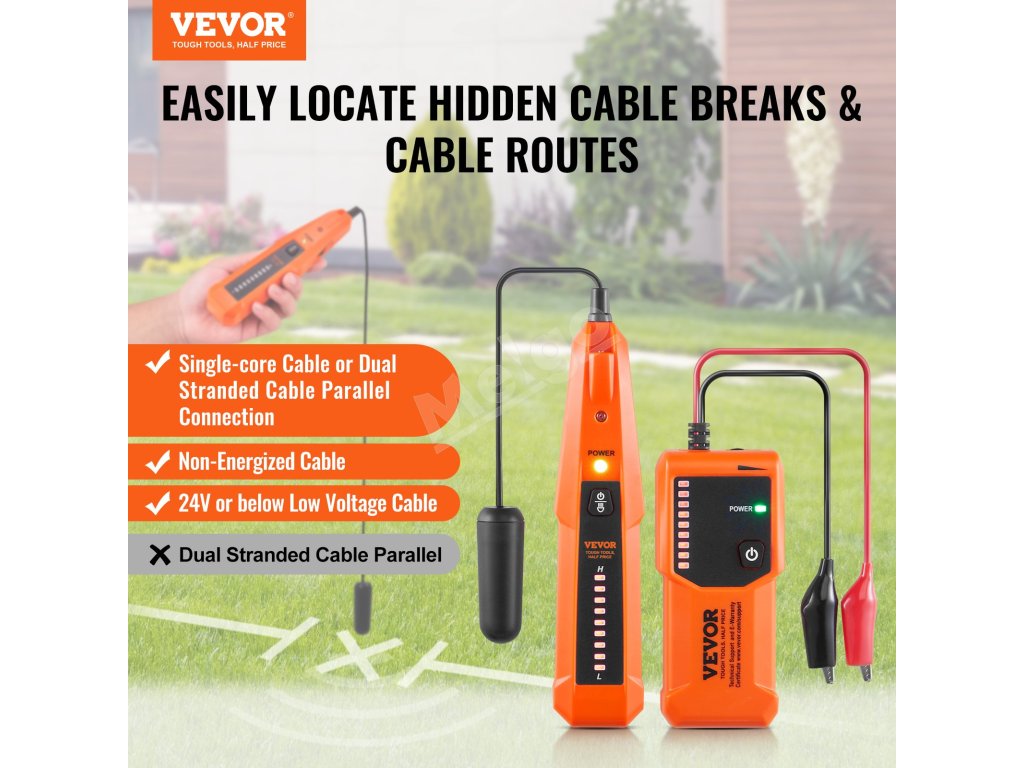 Tento vyhľadávač podzemných káblov lokalizuje káble bez napätia, špeciálne navrhnutý pre jednožilové káble alebo paralelne vedené dvojžilové káble. Ideálny na zisťovanie káblov pre domáce zvieratá, káblov potrubia, podzemných zavlažovacích káblov a káblov v stavebných oblastiach.