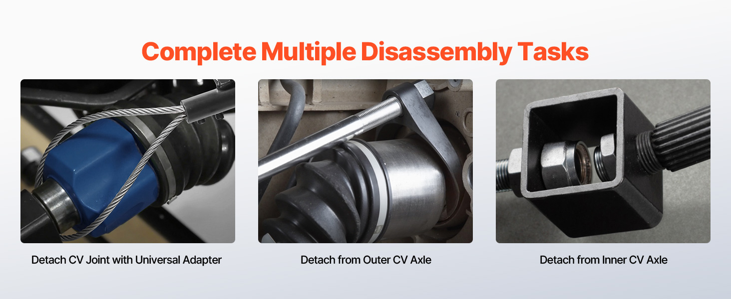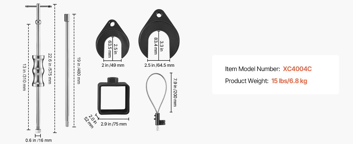 Súprava sťahováka s posuvným kladivom sa dodáva s dvoma vidlicami homokinetických kĺbov (2 palce a 2,5 palca), káblovým adaptérom a vonkajším adaptérom homokinetického kĺbu, aby stabilne a efektívne zvládla širokú škálu aplikácií na vozidlách.