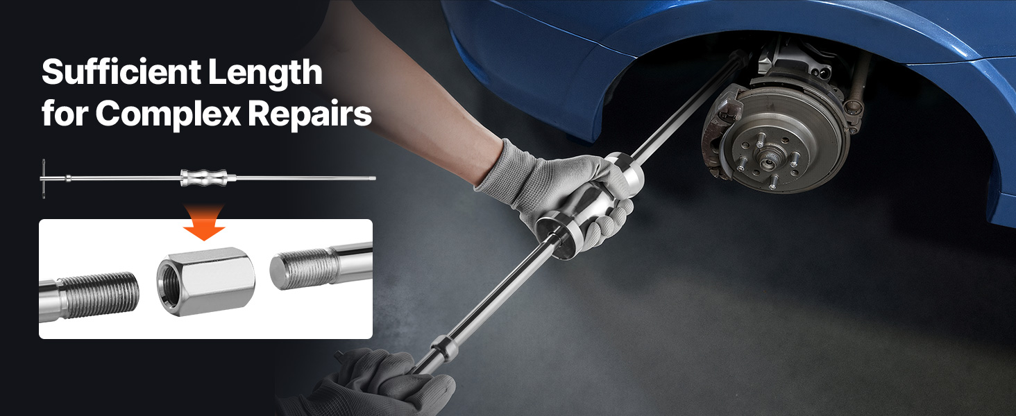 Posuvné kladivo sa pripája k skrutkovanej predlžovacej tyči, ktorá poskytuje dodatočnú dĺžku na dosiahnutie hlbších zostáv náprav v stiesnených priestoroch.