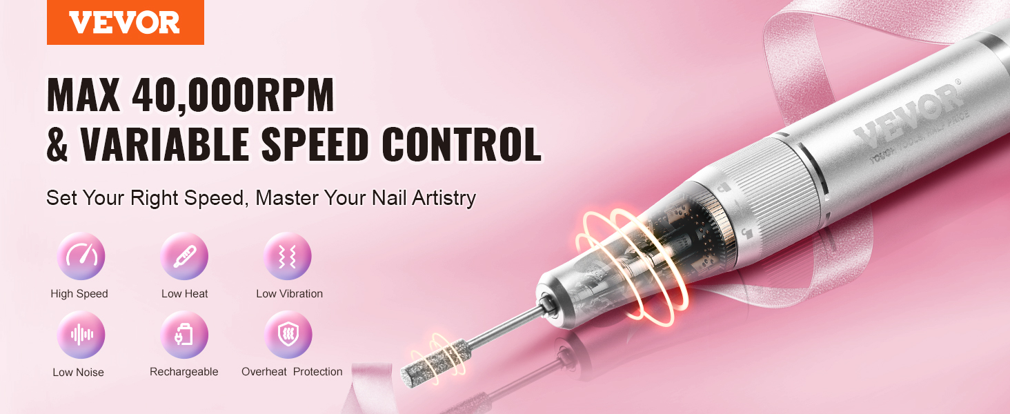 S našou elektrickou akumulátorovou vŕtačkou na nechty dosiahnete rýchlosť až 40 000 otáčok za minútu. Vychutnajte si efektívne a presné leštenie nechtov s minimálnymi vibráciami a hlukom, či už leštíte, tvarujete alebo leštíte nechty. Zažite výsledky profesionálnej kvality doma alebo na cestách.