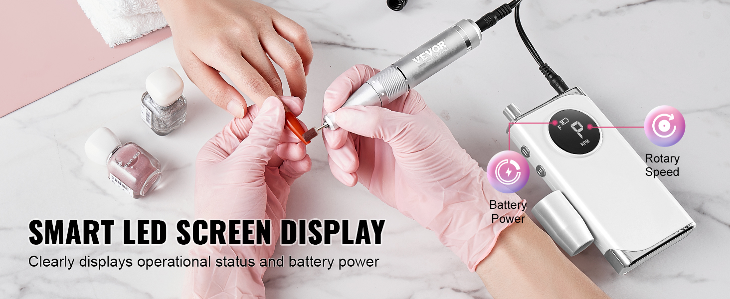 Akumulátorová brúska na akrylový gél, navrhnutá s inteligentným LCD displejom, umožňuje zvoliť požadovanú rýchlosť. Displej LCD poskytuje jasné a ľahko čitateľné informácie a zobrazuje prevádzkový stav v reálnom čase, napríklad rýchlosť a úroveň nabitia batérie.