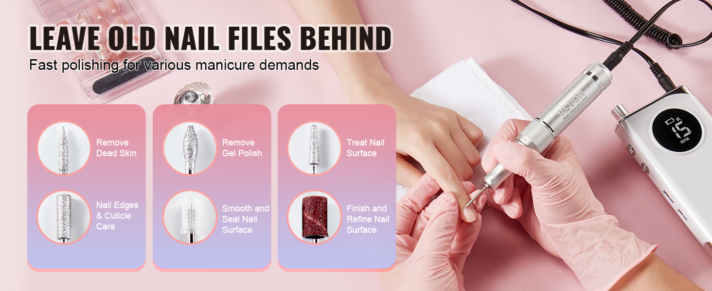 Elektrický akumulátorový pilník na nechty VEVOR sa dodáva so 6 brúsnymi bitmi a 50 brúsnymi pásmi, ktoré poskytujú všetko potrebné na odstránenie odumretej kože, gél laku a zdokonalenie povrchu nechtov k dokonalosti - ideálne pre začiatočníkov aj profesionálov.