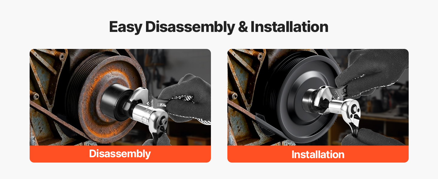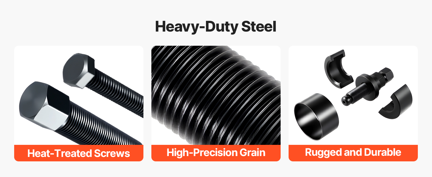 Súprava nástrojov na montáž sťahovača remenice čerpadla je vyrobená z prvotriednej ocele a tepelne upravených skrutiek pre väčšiu odolnosť. Odoláva opotrebeniu a tlaku, čím zaručuje trvanlivosť aj v náročných podmienkach.