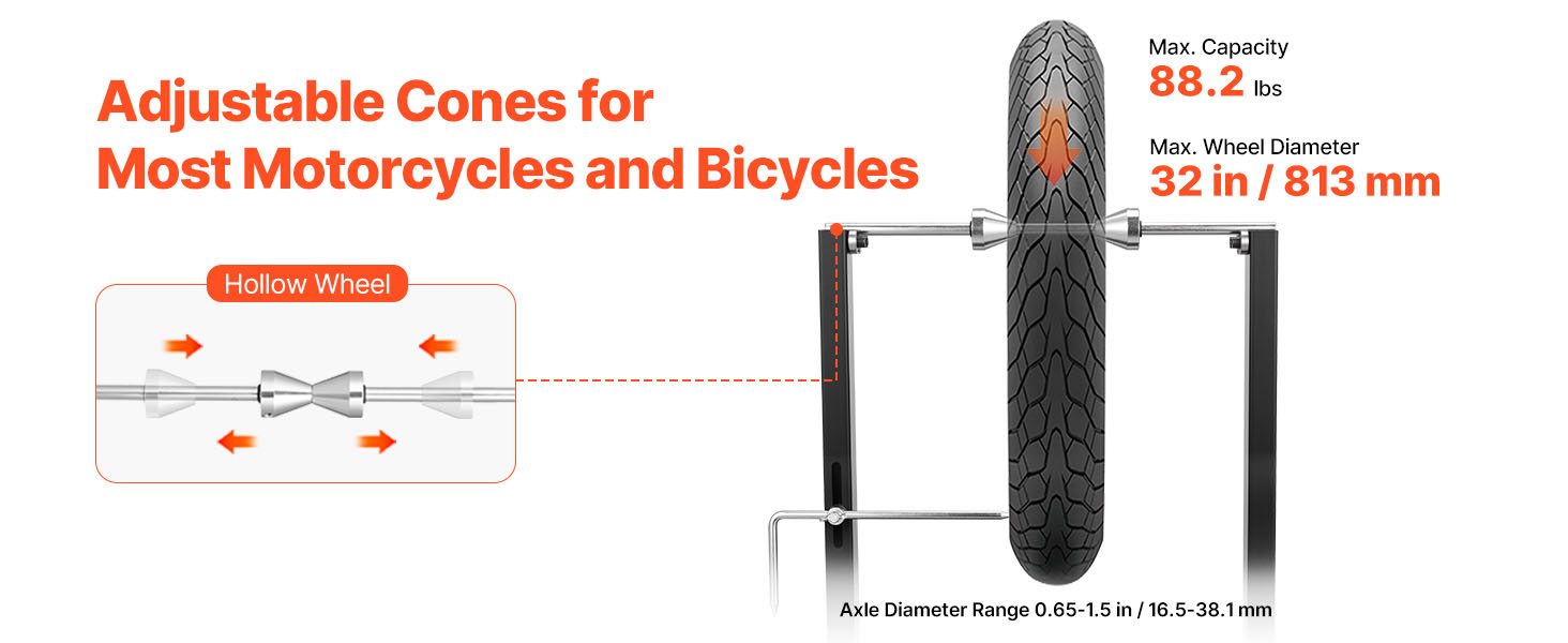 Náš stojan na vyvažovanie kolies motocyklov, určený pre moderné kolesá s dutou osou, obsahuje sadu nastaviteľných strediacich kužeľov, ktoré sú vhodné pre väčšinu pouličných bicyklov, cruiserov a dobrodružných cestovných motocyklov.