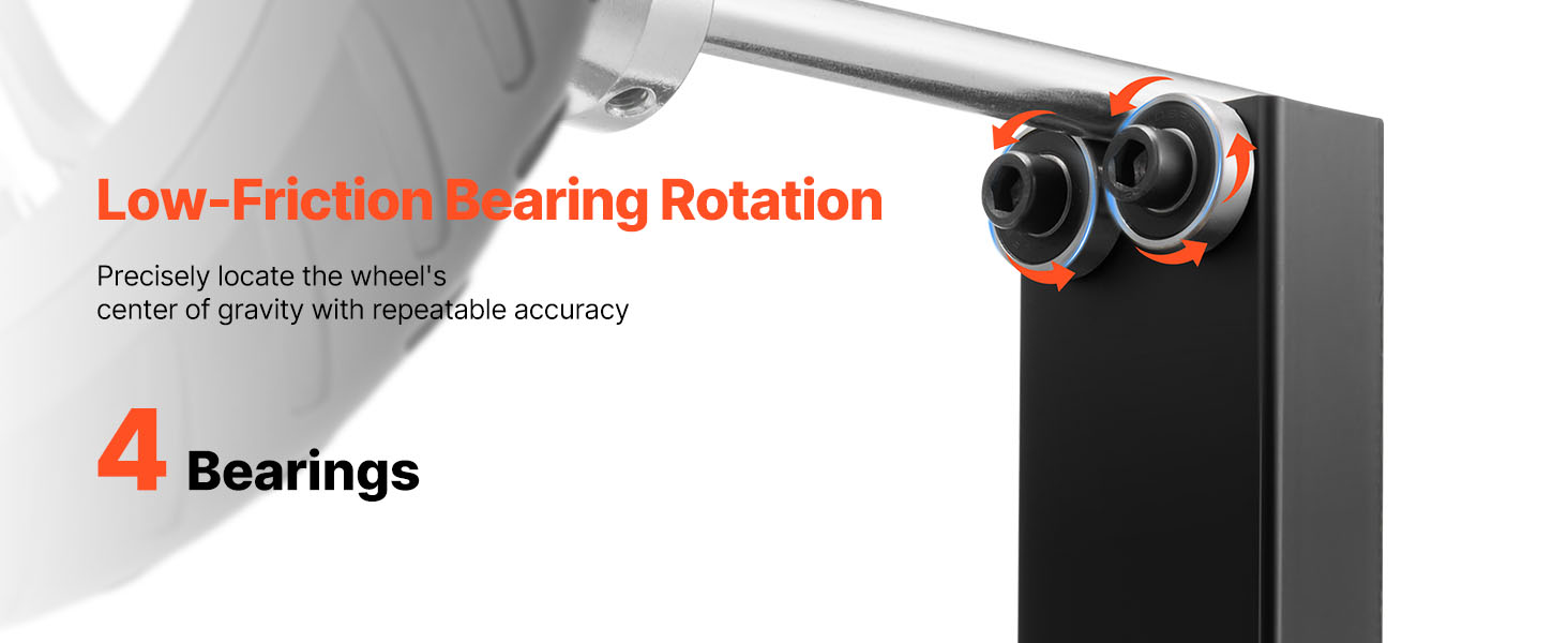 Presné ložiská tohto vyvažovača kolies motocyklov zabezpečujú otáčanie bez trenia. Kolesá sa otáčajú bez námahy a zastavujú sa v najťažšom bode, čím sa zakaždým zabezpečí presné vyváženie.
