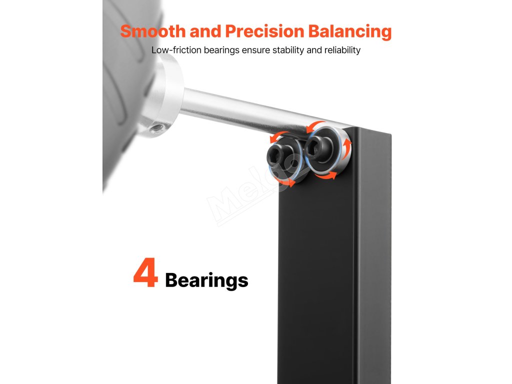 Presné ložiská tohto vyvažovača kolies motocyklov zabezpečujú otáčanie bez trenia. Kolesá sa otáčajú bez námahy a zastavujú sa v najťažšom bode, čím sa zakaždým zabezpečí presné vyváženie.