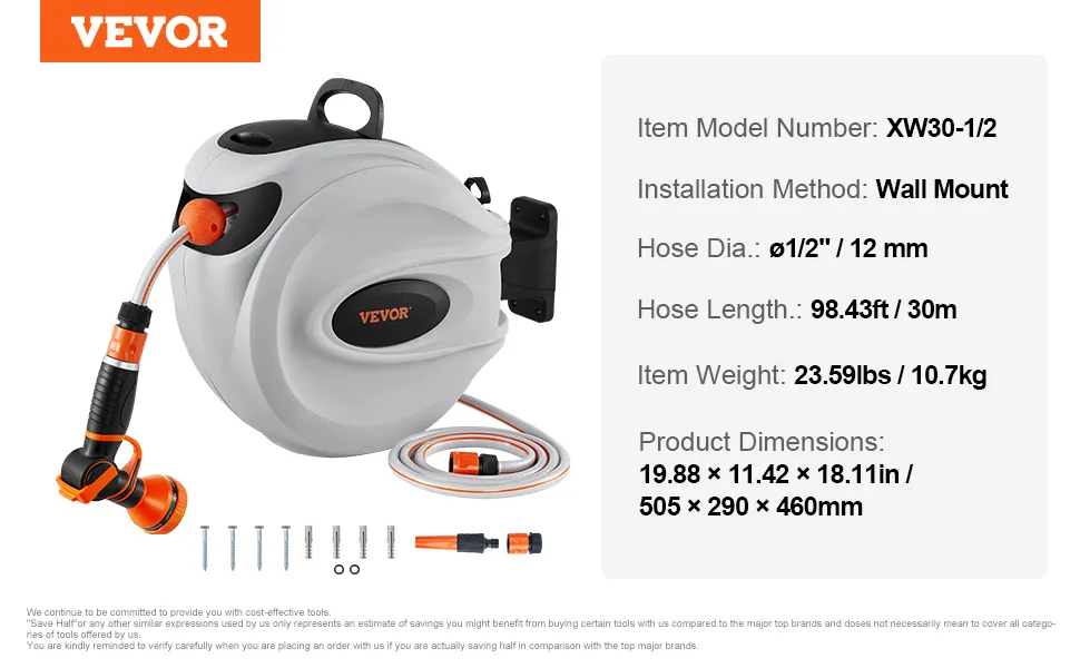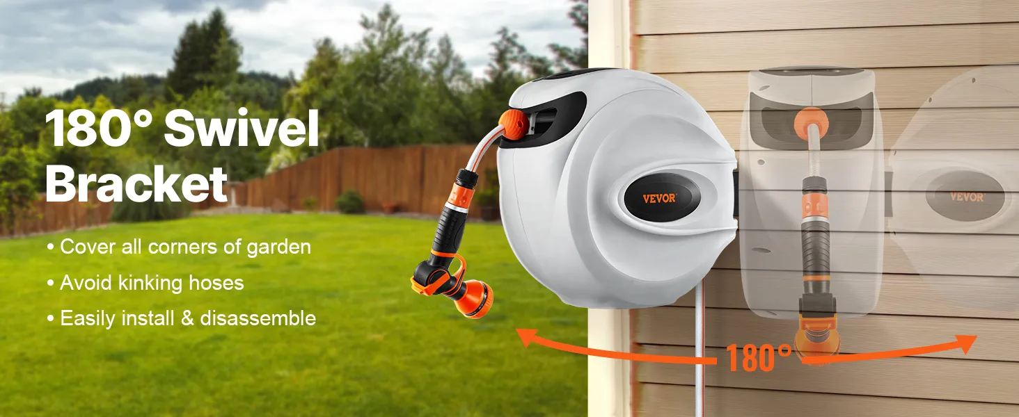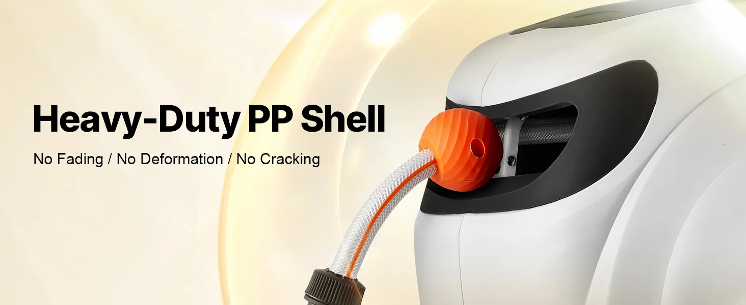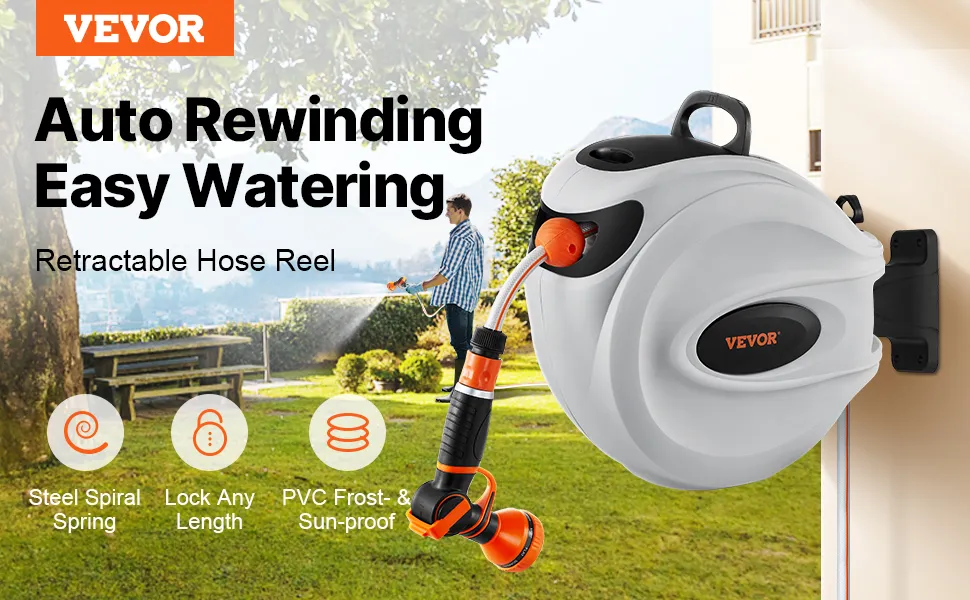 Tento navíjací bubon na hadicu je vybavený odolnými kovovými konektormi odolnými proti úniku, systémom pomalého navíjania a 9 nastaveniami postreku. Jeho konštrukcia odolná voči slnku a mrazu je vhodná do každého počasia, s nastaviteľným zámkom a rukoväťou na jednoduché skladovanie a mobilitu. Vyšší prietok vody zvyšuje účinnosť.