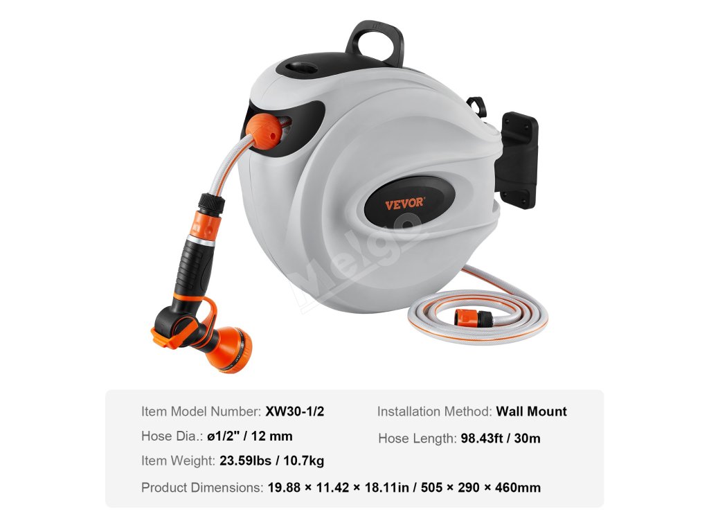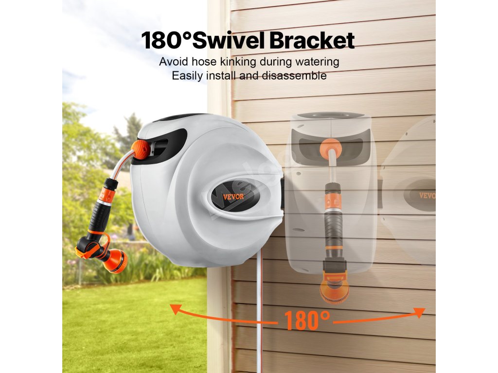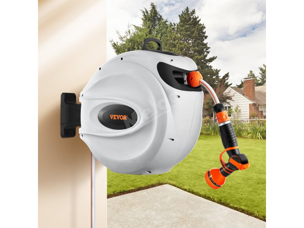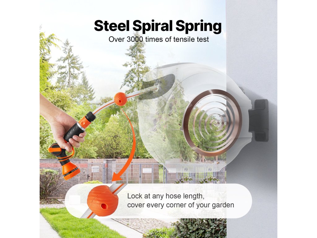 Tento navíjací bubon na hadicu je vybavený odolnými kovovými konektormi odolnými proti úniku, systémom pomalého navíjania a 9 nastaveniami postreku. Jeho konštrukcia odolná voči slnku a mrazu je vhodná do každého počasia, s nastaviteľným zámkom a rukoväťou na jednoduché skladovanie a mobilitu. Vyšší prietok vody zvyšuje účinnosť.