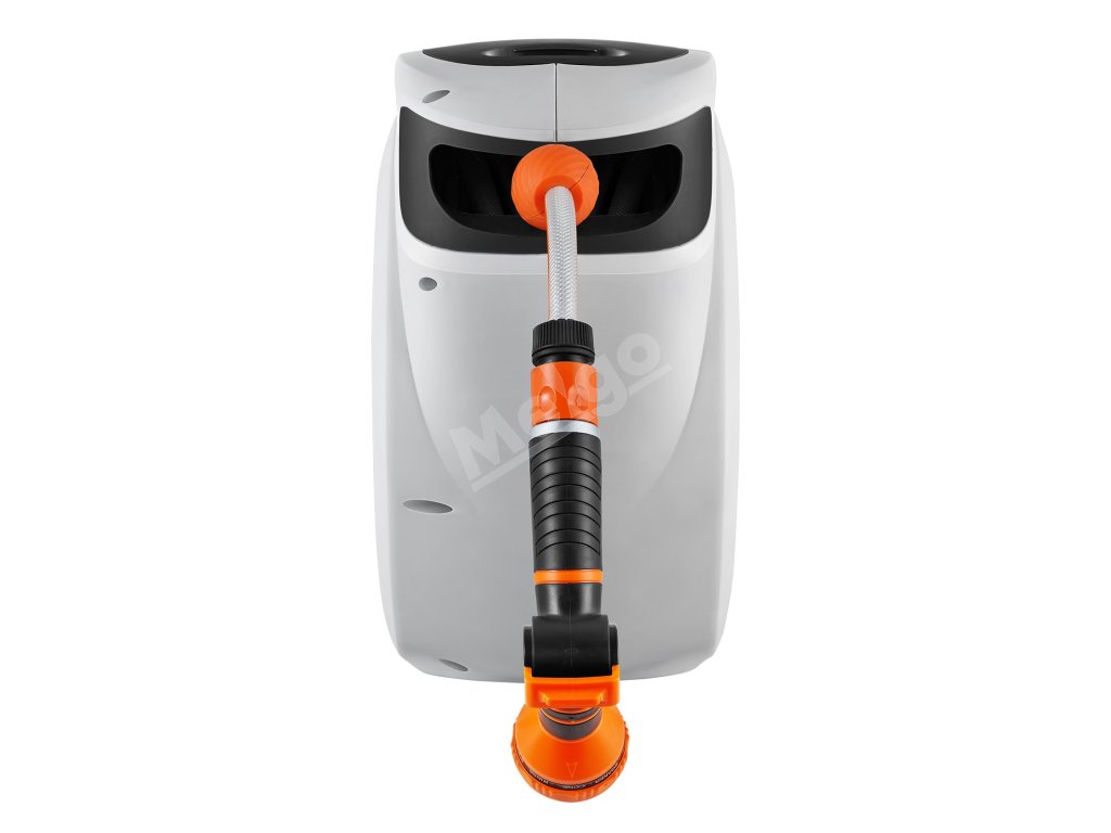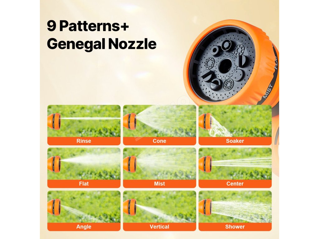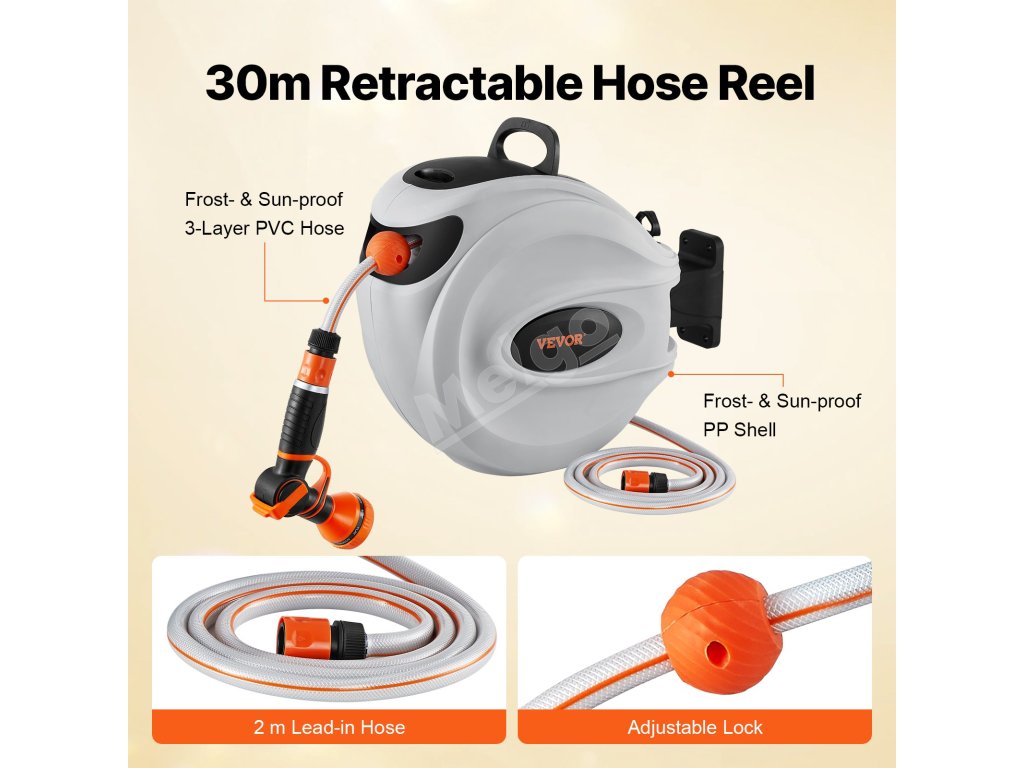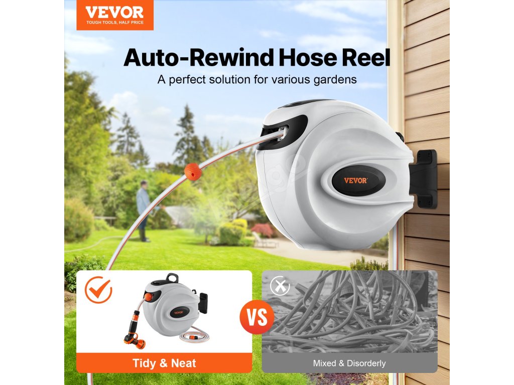 Tento navíjací bubon na hadicu je vybavený odolnými kovovými konektormi odolnými proti úniku, systémom pomalého navíjania a 9 nastaveniami postreku. Jeho konštrukcia odolná voči slnku a mrazu je vhodná do každého počasia, s nastaviteľným zámkom a rukoväťou na jednoduché skladovanie a mobilitu. Vyšší prietok vody zvyšuje účinnosť.
