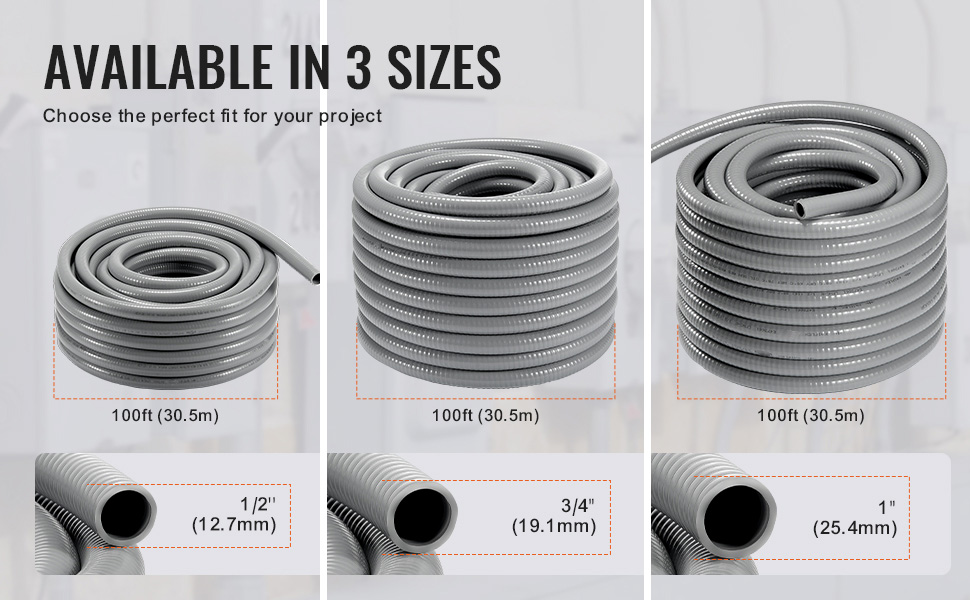 Naše 100-metrové flexibilné elektrické vedenie ponúkame v troch praktických veľkostiach: 1/2" (12,7 mm), 3/4" (19,1 mm) a 1" (25,4 mm). Táto rozmanitosť zaručuje, že si môžete nájsť ideálnu voľbu pre potreby vášho konkrétneho projektu, vďaka čomu je inštalácia efektívnejšia a prispôsobená vašim požiadavkám.