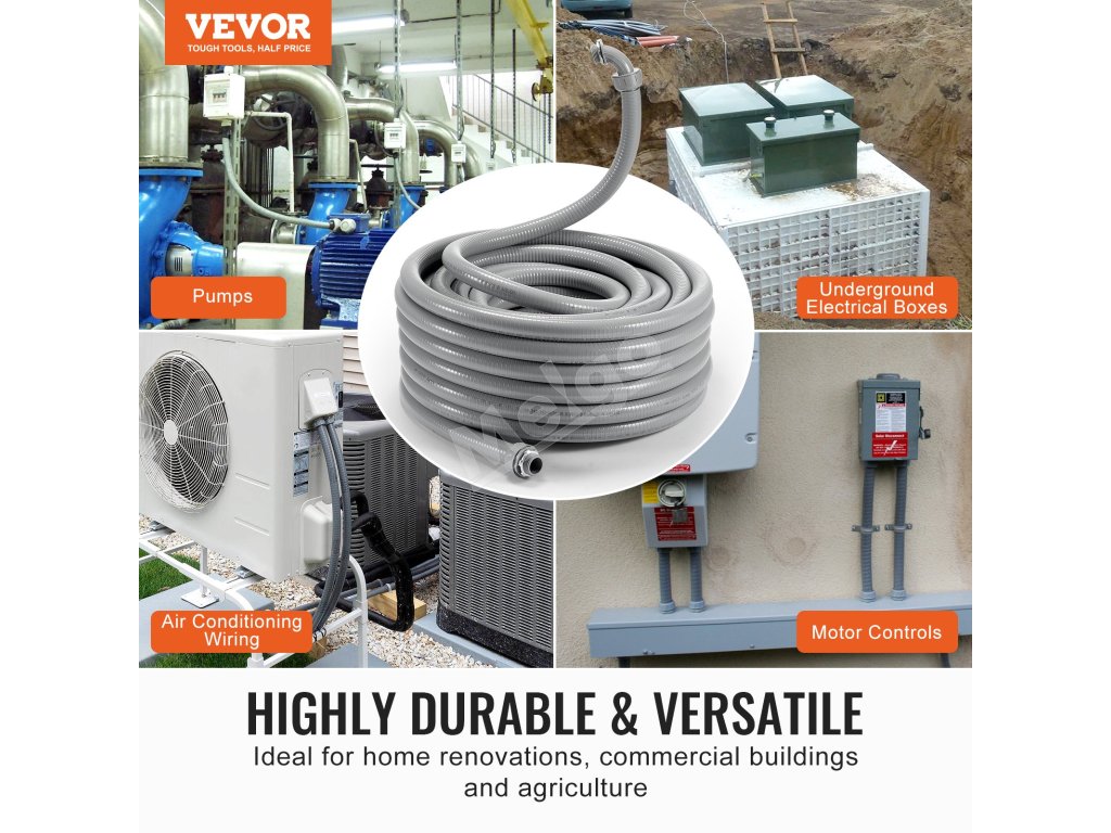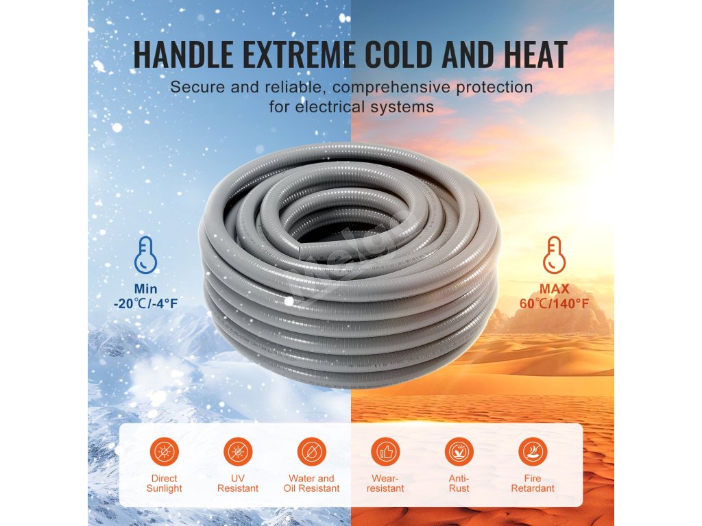 Naše flexibilné PVC kvapalinotesné potrubie sa môže pochváliť výnimočnou trvanlivosťou, pevnosťou v ťahu a odolnosťou proti stlačeniu, vďaka čomu je ideálne do náročných vonkajších podmienok. Odoláva priamemu slnečnému žiareniu a možno ho zakopať pod zem, čím poskytuje vynikajúcu ochranu pre vás a vaše elektrické zariadenia.