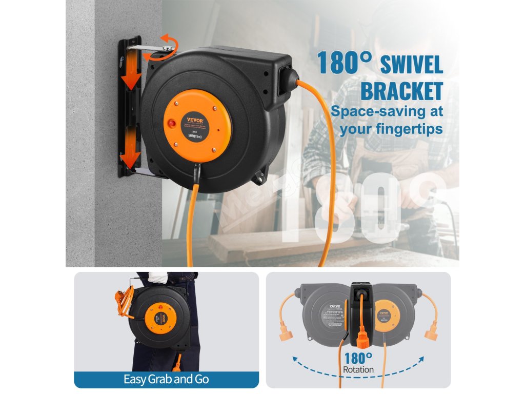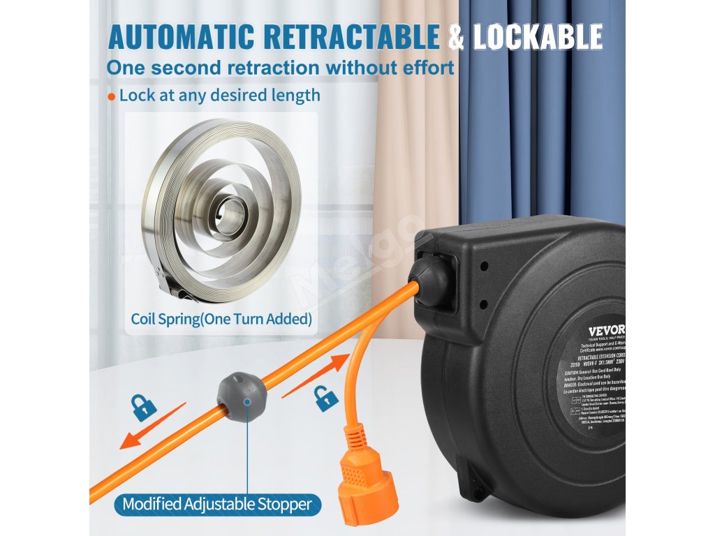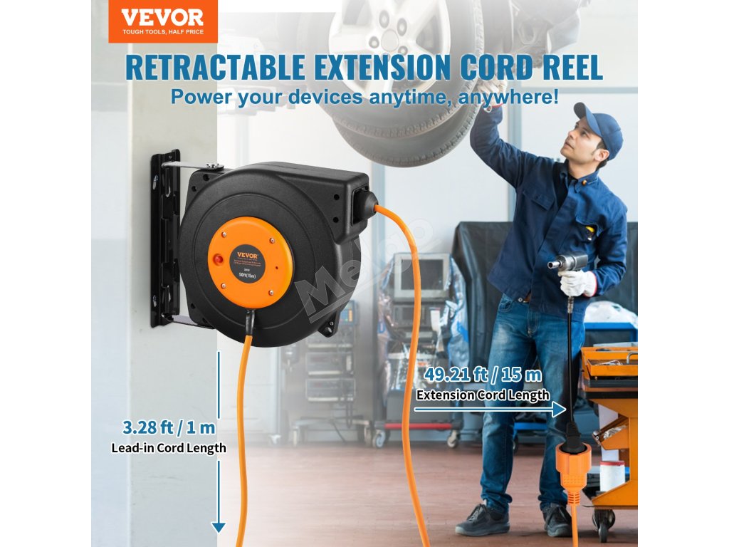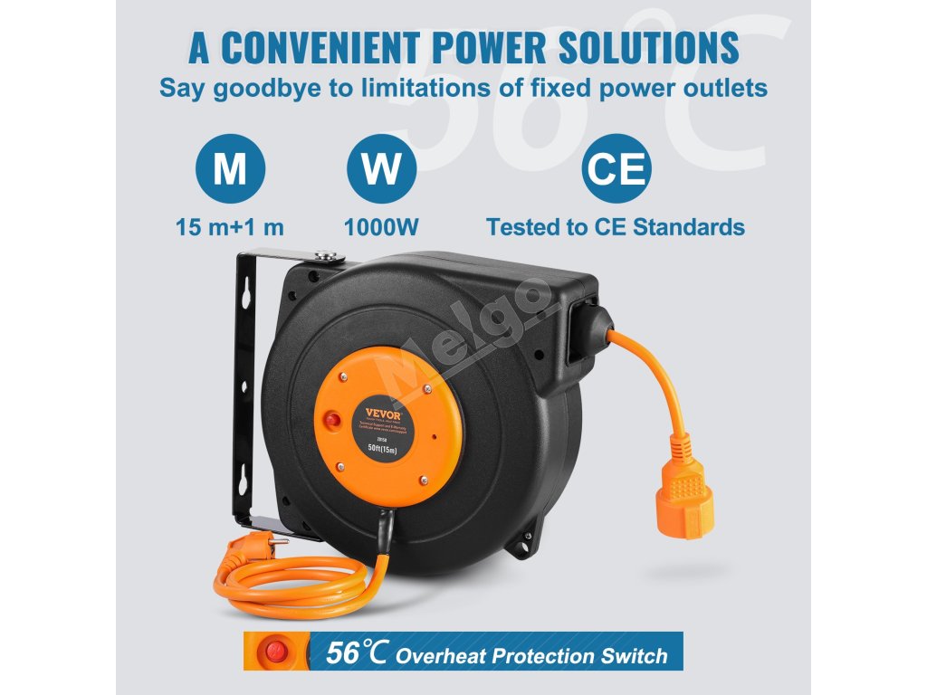 Náš navíjací bubon s predlžovacou šnúrou má 15 m predlžovaciu šnúru, 1 m prívodnú šnúru, automatický navíjací systém a vysokú nosnosť 1000 W. Zostaňte v bezpečí vďaka certifikácii CE a ochrane proti prehriatiu, ktorá automaticky preruší napájanie pri teplote 56 °C. Napájajte svoje zariadenia kdekoľvek s VEVOR!