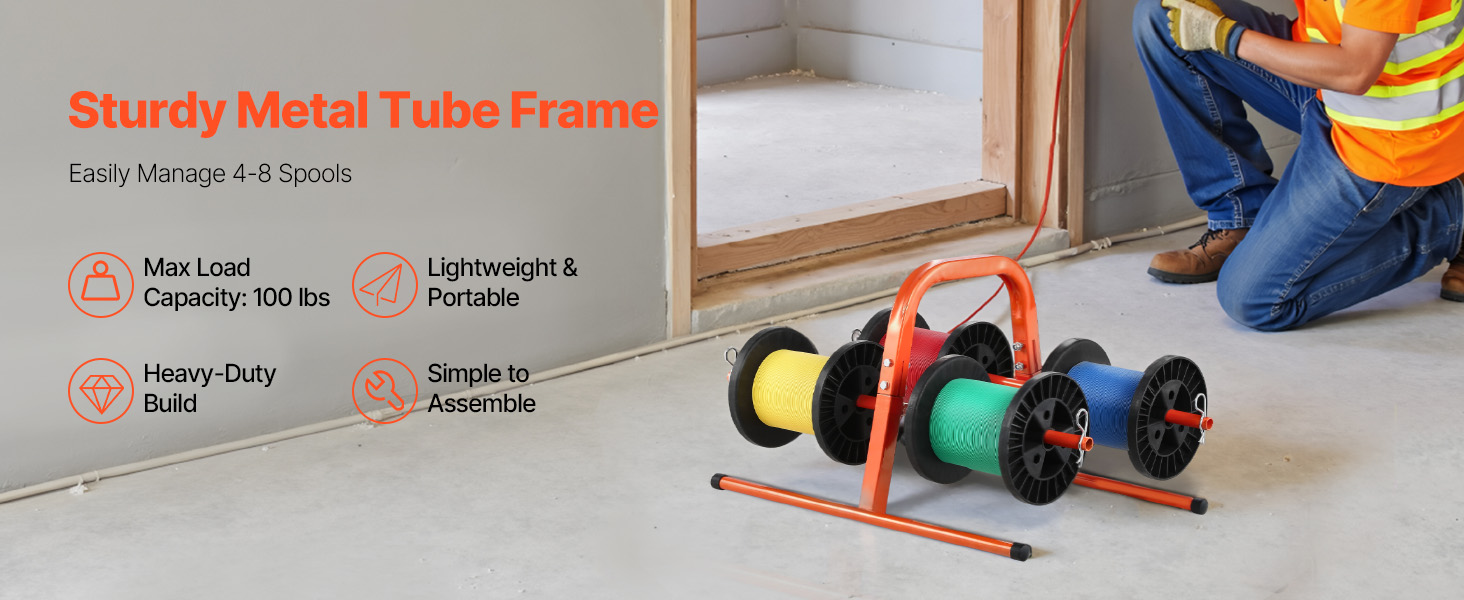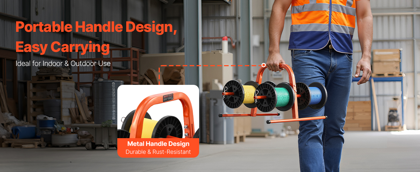 Tento ručný držiak je vyrobený z robustnej oceľovej rúrky Q195 a je konštruovaný tak, aby vydržal. Podporuje 4-8 cievok s maximálnym priemerom cievky 9,45 palca. S hmotnosťou 4,85 kg je ľahký a prenosný. Práškovo lakovaný povrch je odolný voči korózii, takže je ideálny na všestranné vedenie káblov v priemyselných odvetviach.