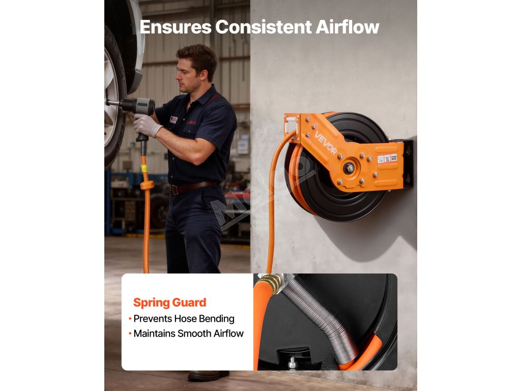 Rozlúčte sa so zamotanými hadicami a neporiadkom na podlahe. Tento navíjací bubon na vzduchovú hadicu pomáha zabrániť zamotaniu a zalomeniu hadice, vďaka čomu môžete pracovať rýchlejšie a efektívnejšie v prehľadnejšom pracovnom priestore – hadica je vždy po ruke a ľahko dostupná.
