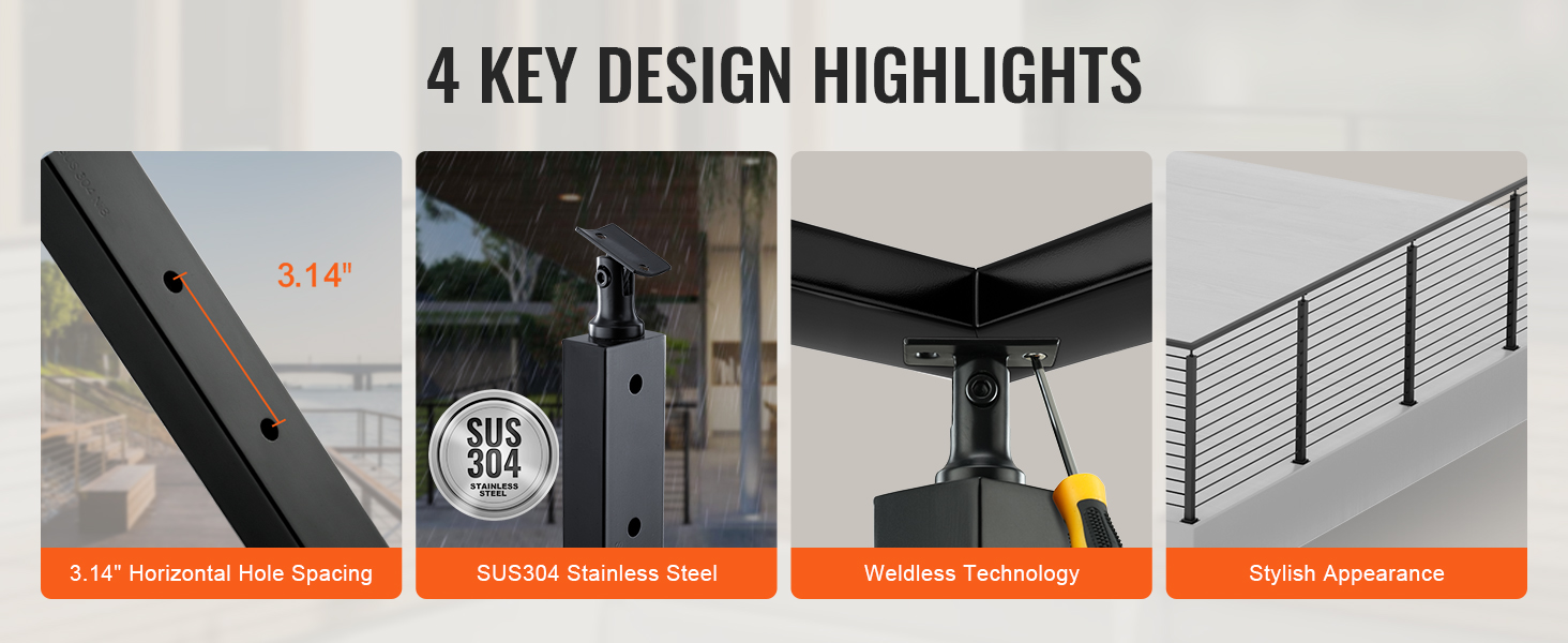 Náš stĺpik káblového zábradlia je celý vyrobený z nehrdzavejúcej ocele SUS304 a vyznačuje sa 3,14" rozstupom otvorov, ktorý je v súlade so stavebnými normami. Vďaka bezšvovej konštrukcii bez zvarov a štýlovej čiernej povrchovej úprave sú vhodné na rôzne nastavenia a spájajú módu s funkčnosťou.