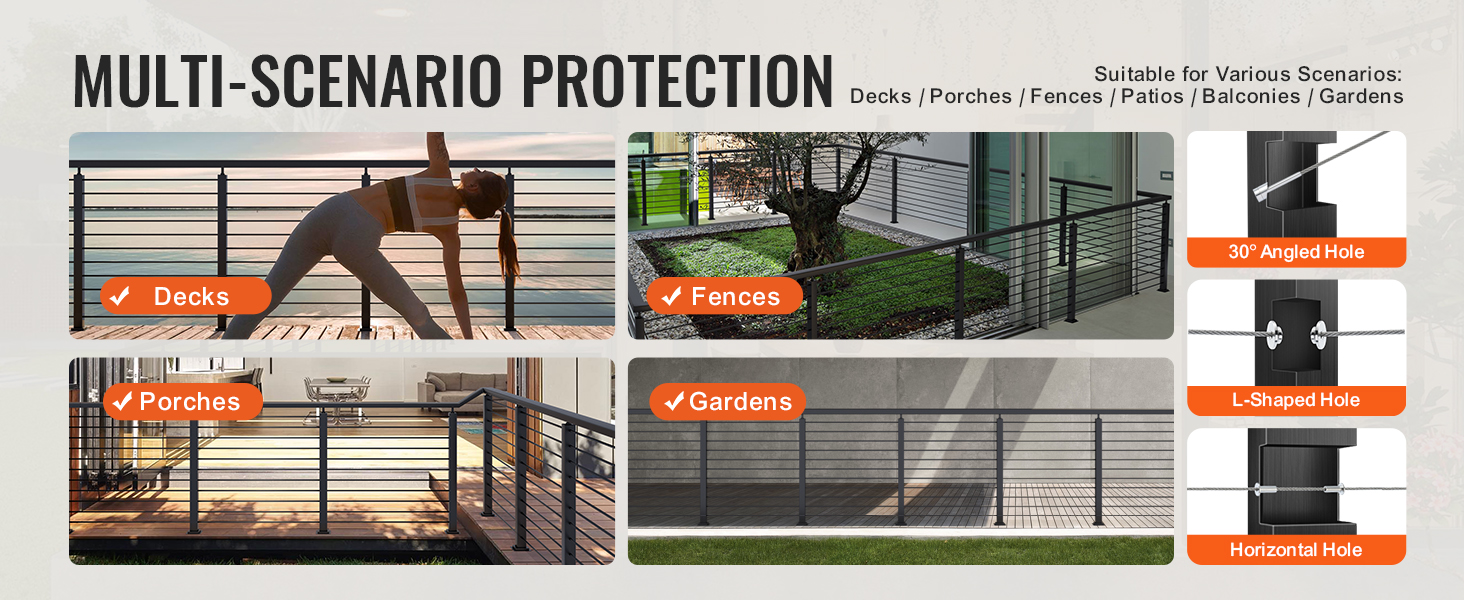 Naše stĺpiky zábradlia sú vhodné na vnútorné aj vonkajšie ochranné aplikácie. Používajte ich na palubách, verandách, plotoch, terasách, balkónoch, záhradách, obytných budovách, komerčných kanceláriách, hoteloch, garážach a v rôznych iných scenároch na zvýšenie bezpečnosti.