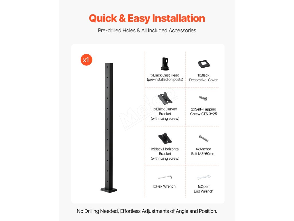 Toto schodiskové zábradlie sa dodáva s predvŕtanými otvormi, vďaka čomu nie je potrebné ďalšie vŕtanie. Umožňuje jednoduché nastavenie uhla a polohy počas inštalácie a obsahuje všetko potrebné príslušenstvo, čo šetrí prácu.