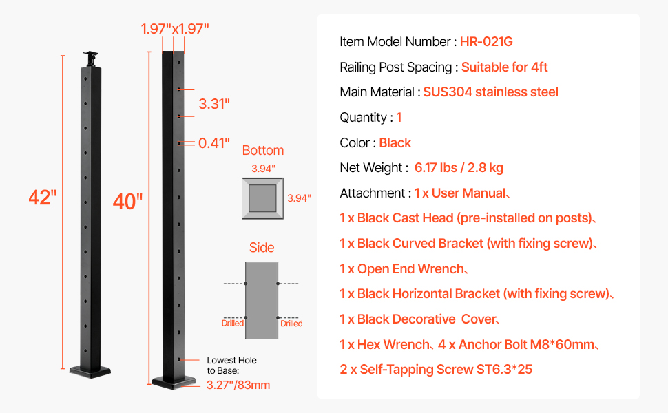 Stĺpik káblového zábradlia 42×2×2 inch, nerezový, predvŕtaný, čierny