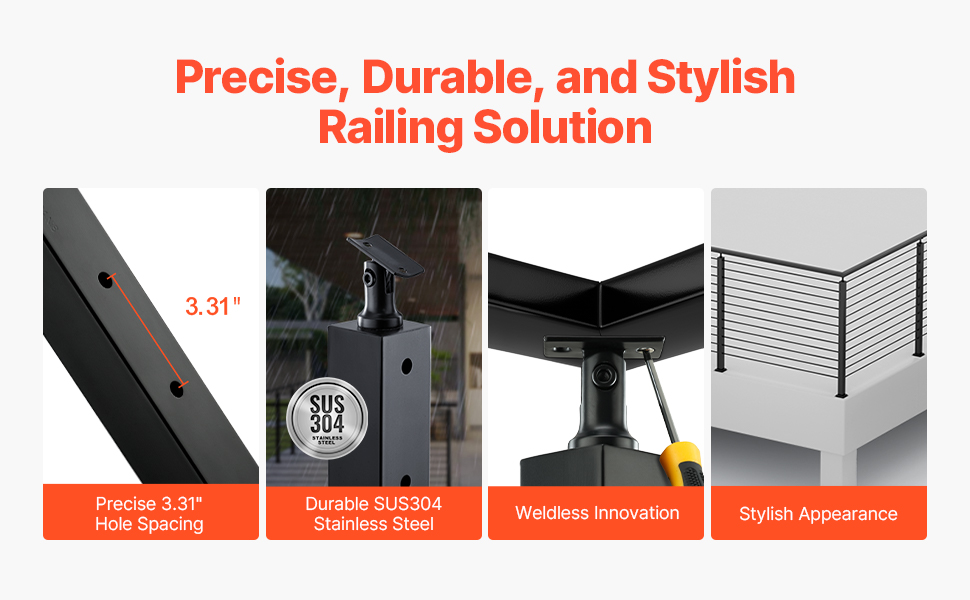 Náš systém káblového zábradlia je vyrobený z vysokokvalitnej nehrdzavejúcej ocele SUS304 a vyznačuje sa 3" rozstupmi otvorov, ktoré sú v súlade so stavebnými predpismi. Je nezváraný s čiernou povrchovou úpravou, vďaka čomu je štýlový a univerzálny pre rôzne nastavenia.