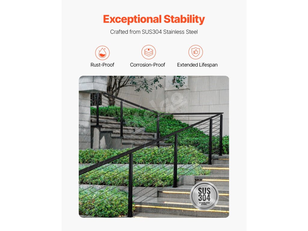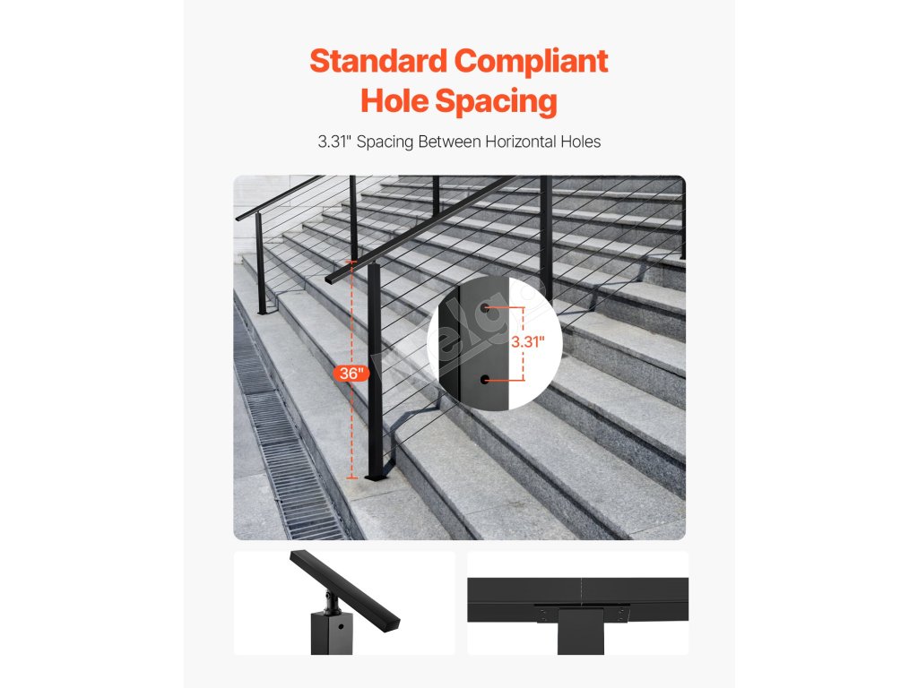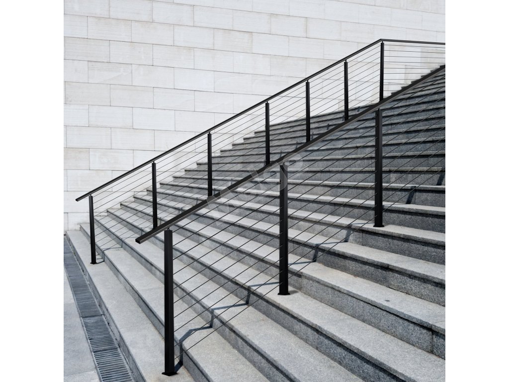 Náš systém káblového zábradlia je vyrobený z vysokokvalitnej nehrdzavejúcej ocele SUS304 a vyznačuje sa 3" rozstupmi otvorov, ktoré sú v súlade so stavebnými predpismi. Je nezváraný s čiernou povrchovou úpravou, vďaka čomu je štýlový a univerzálny pre rôzne nastavenia.