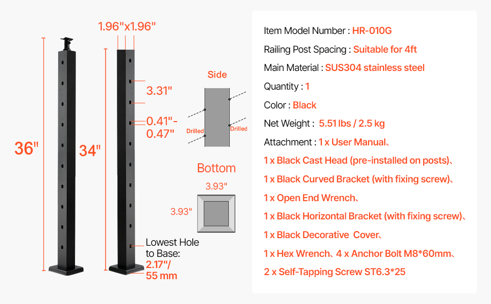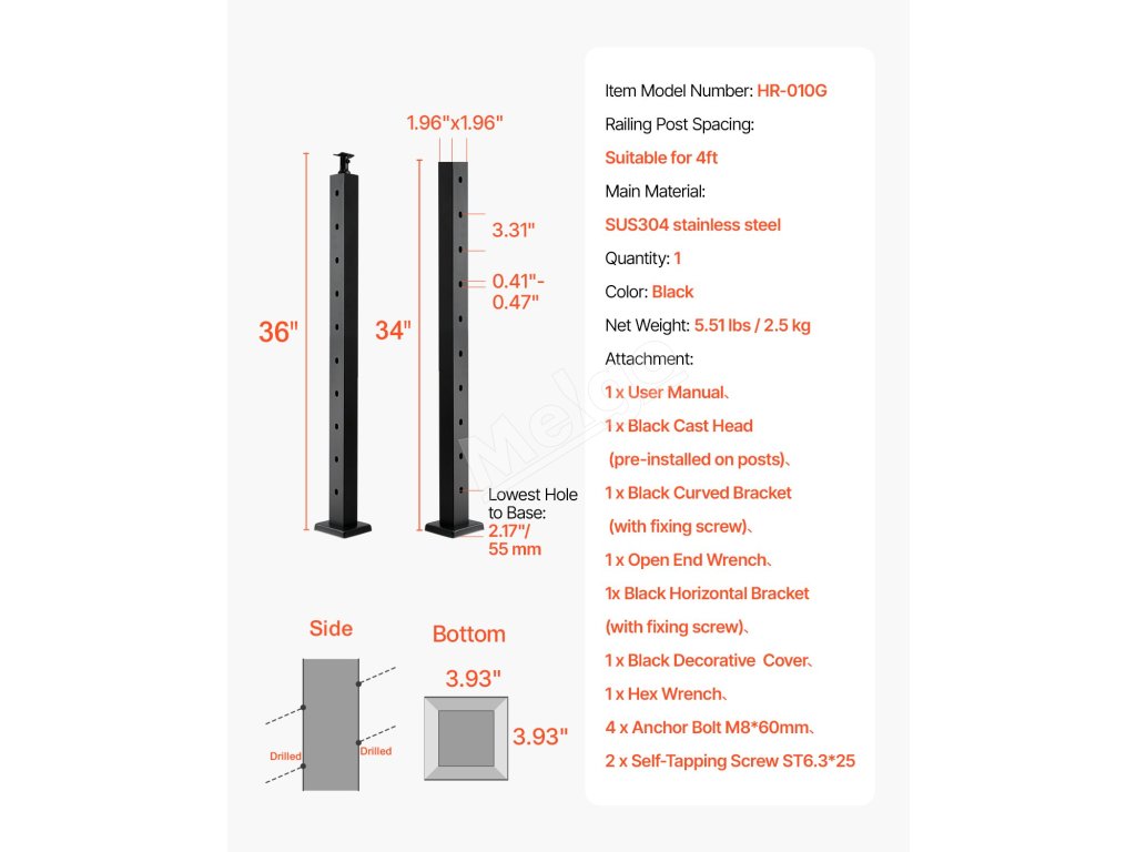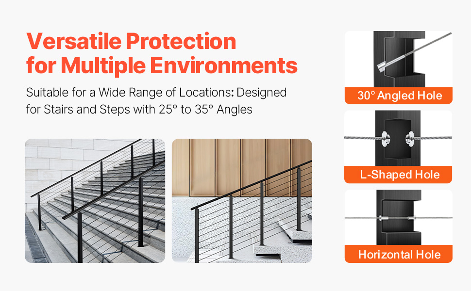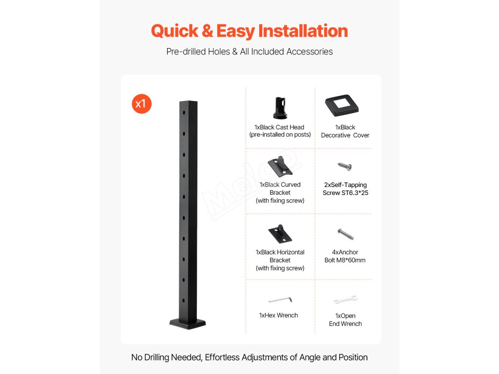 Toto schodiskové zábradlie sa dodáva s predvŕtanými otvormi, vďaka čomu nie je potrebné ďalšie vŕtanie. Umožňuje jednoduché nastavenie uhla a polohy počas inštalácie a obsahuje všetko potrebné príslušenstvo, čo šetrí prácu.