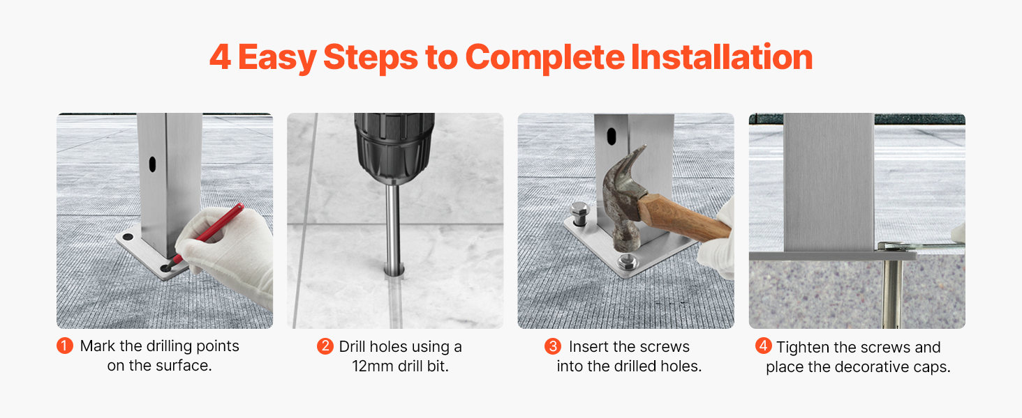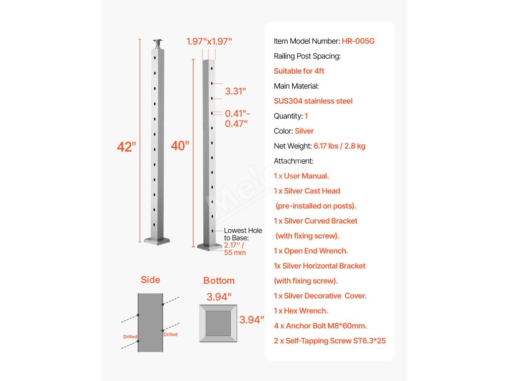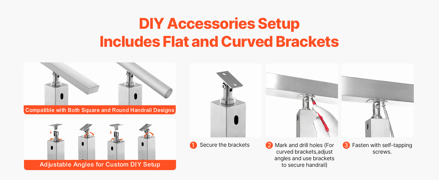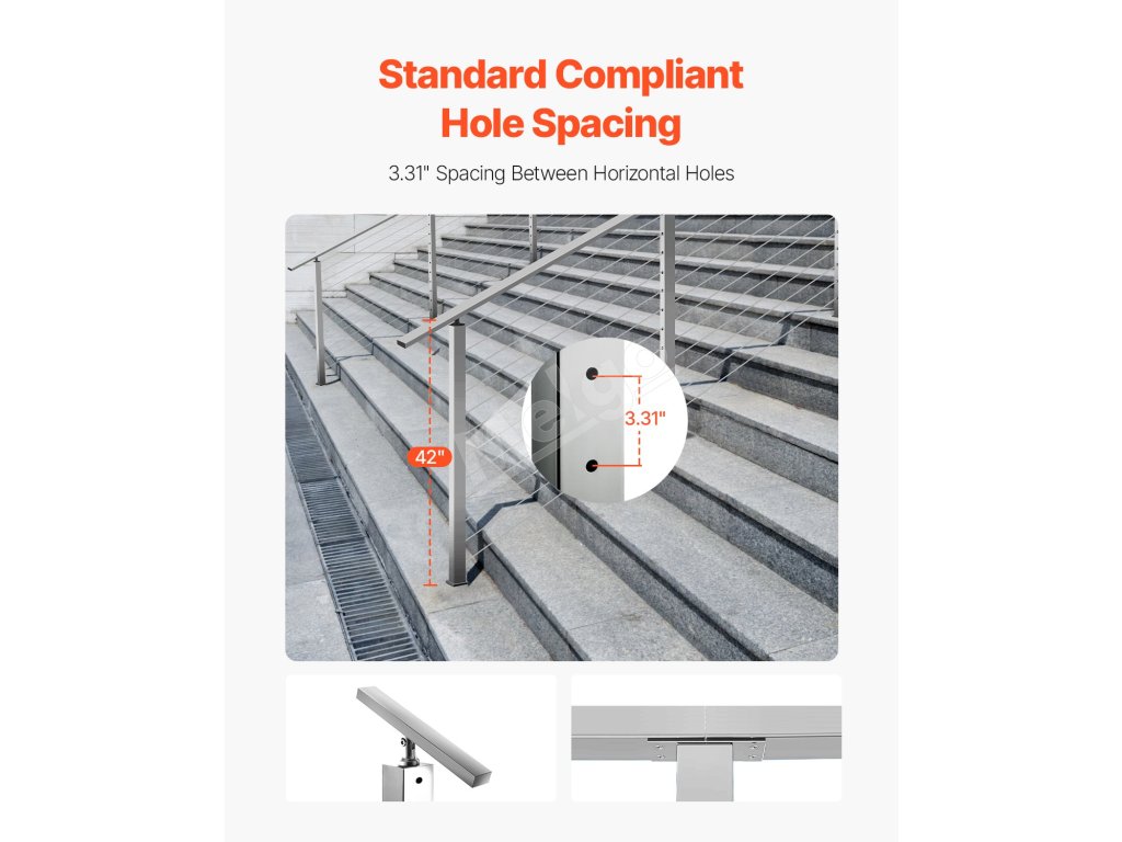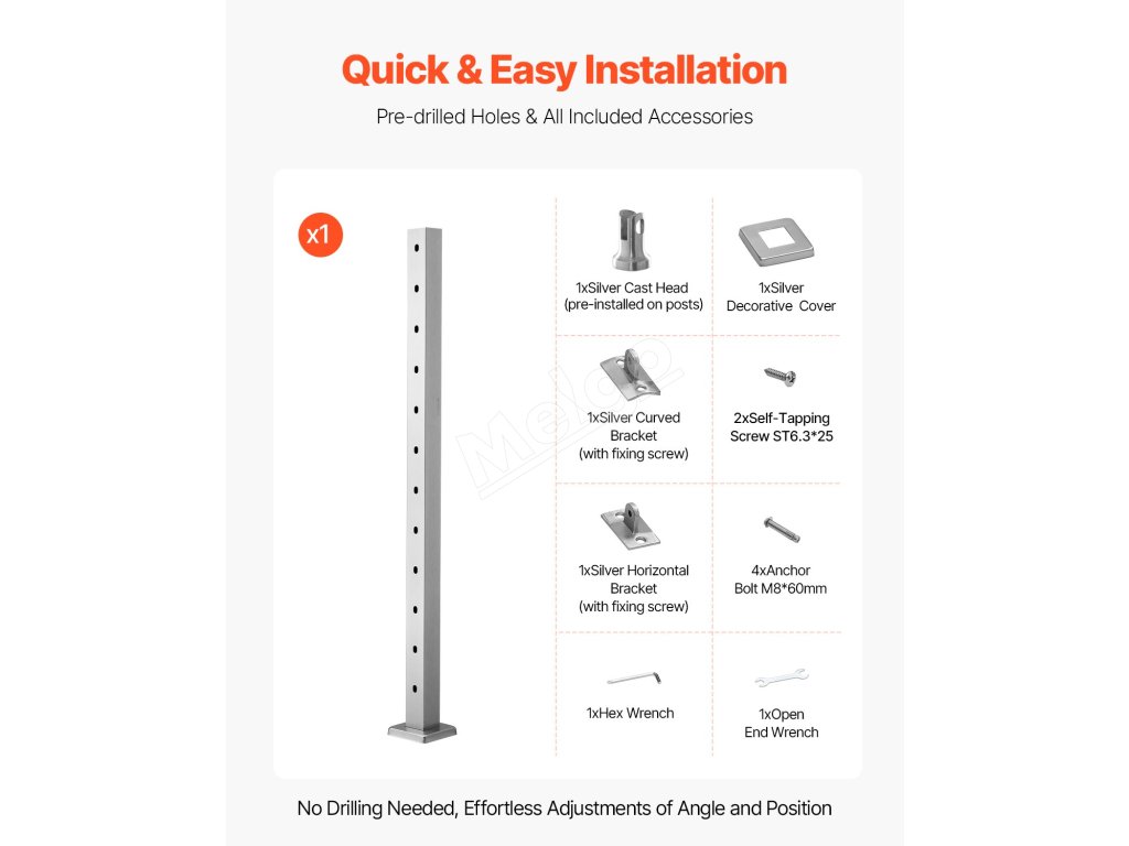 Toto schodiskové zábradlie sa dodáva s predvŕtanými otvormi, vďaka čomu nie je potrebné ďalšie vŕtanie. Umožňuje jednoduché nastavenie uhla a polohy počas inštalácie a obsahuje všetko potrebné príslušenstvo, čo šetrí prácu.