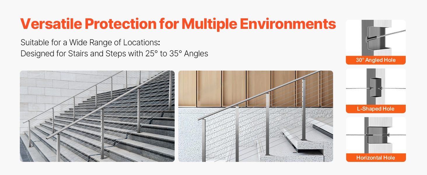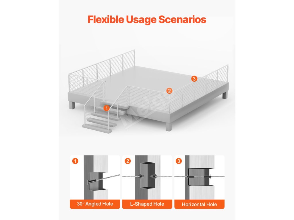 Naša súprava káblového zábradlia obsahuje vodorovné a zakrivené podpery, ktoré sú kompatibilné so zábradlím zo štvorcových a okrúhlych rúrok. Umožňuje vytvoriť si uhly zábradlia na mieru podľa vlastného uváženia.