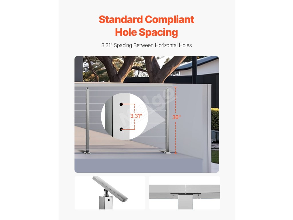 Náš systém káblového zábradlia je vyrobený z vysokokvalitnej nehrdzavejúcej ocele SUS304 a vyznačuje sa 3" rozstupmi otvorov, ktoré sú v súlade so stavebnými predpismi. Je nezváraný s čiernou povrchovou úpravou, vďaka čomu je štýlový a univerzálny pre rôzne nastavenia.