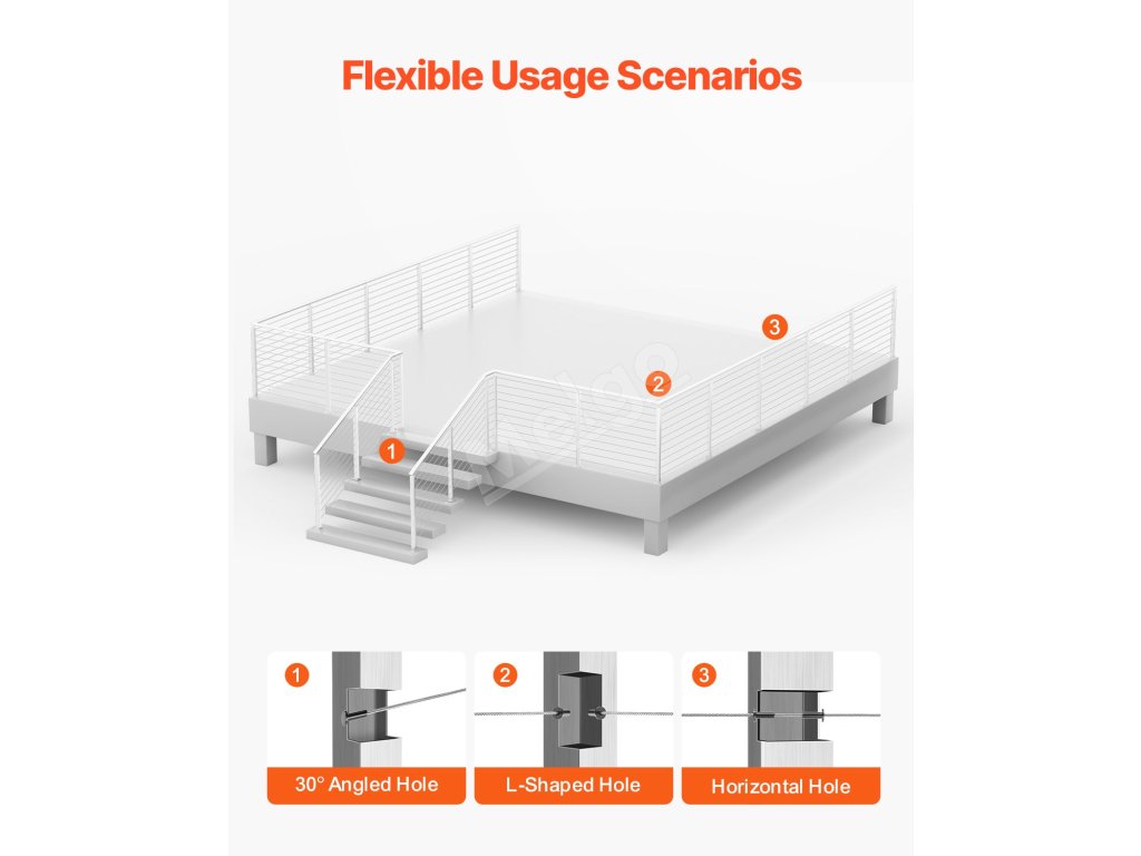 Naša súprava káblového zábradlia obsahuje vodorovné a zakrivené podpery, ktoré sú kompatibilné so zábradlím zo štvorcových a okrúhlych rúrok. Umožňuje vytvoriť si uhly zábradlia na mieru podľa vlastného uváženia.