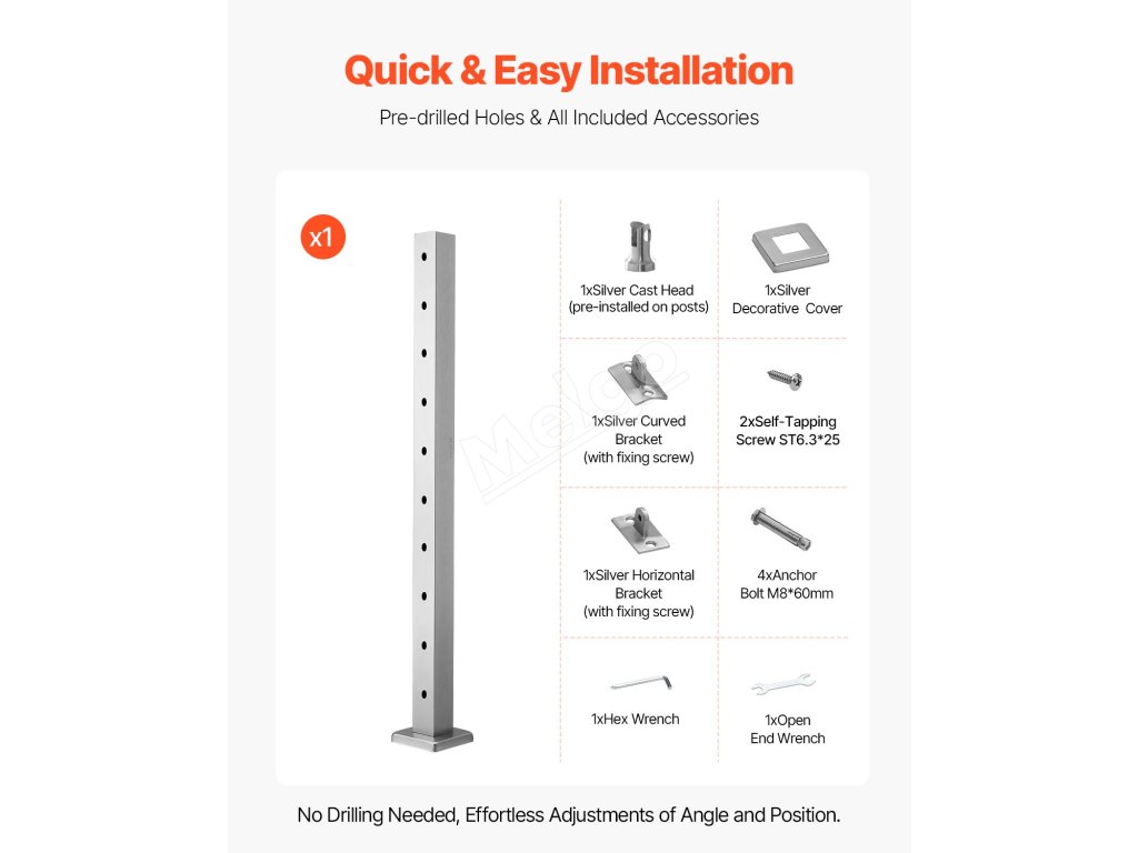 Toto schodiskové zábradlie sa dodáva s predvŕtanými otvormi, vďaka čomu nie je potrebné ďalšie vŕtanie. Umožňuje jednoduché nastavenie uhla a polohy počas inštalácie a obsahuje všetko potrebné príslušenstvo, čo šetrí prácu.