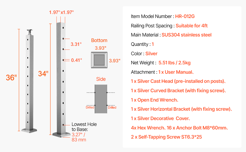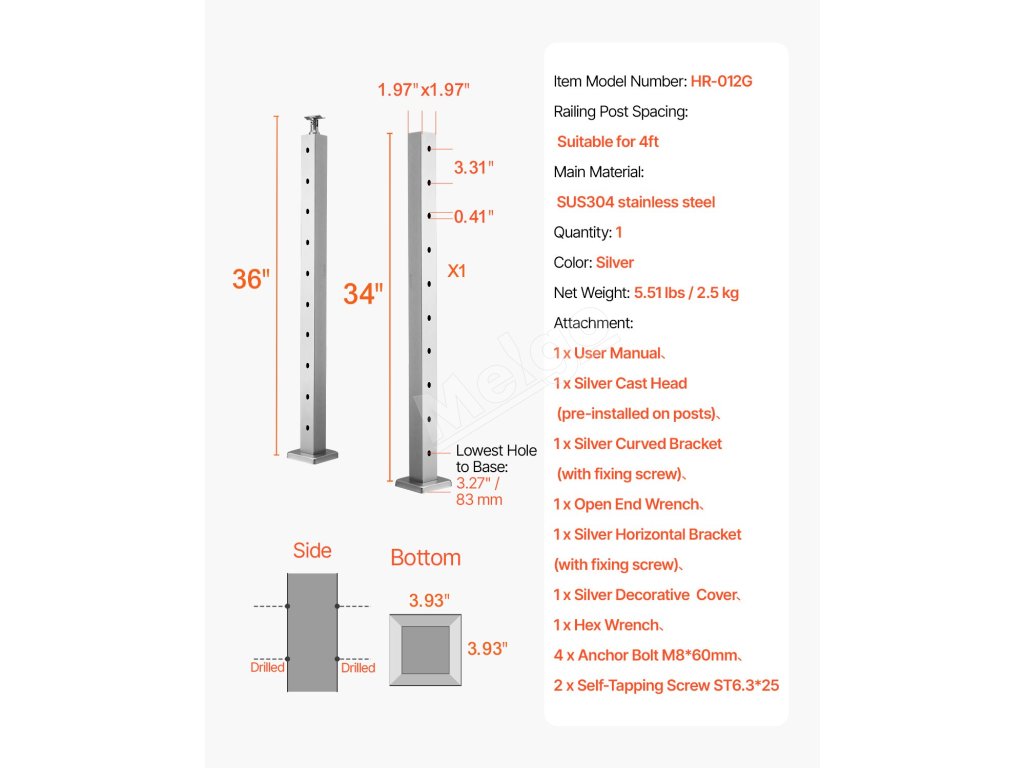 Stĺpik nerez na káblové zábradlie 36×2×2 in, predvŕtané otvory