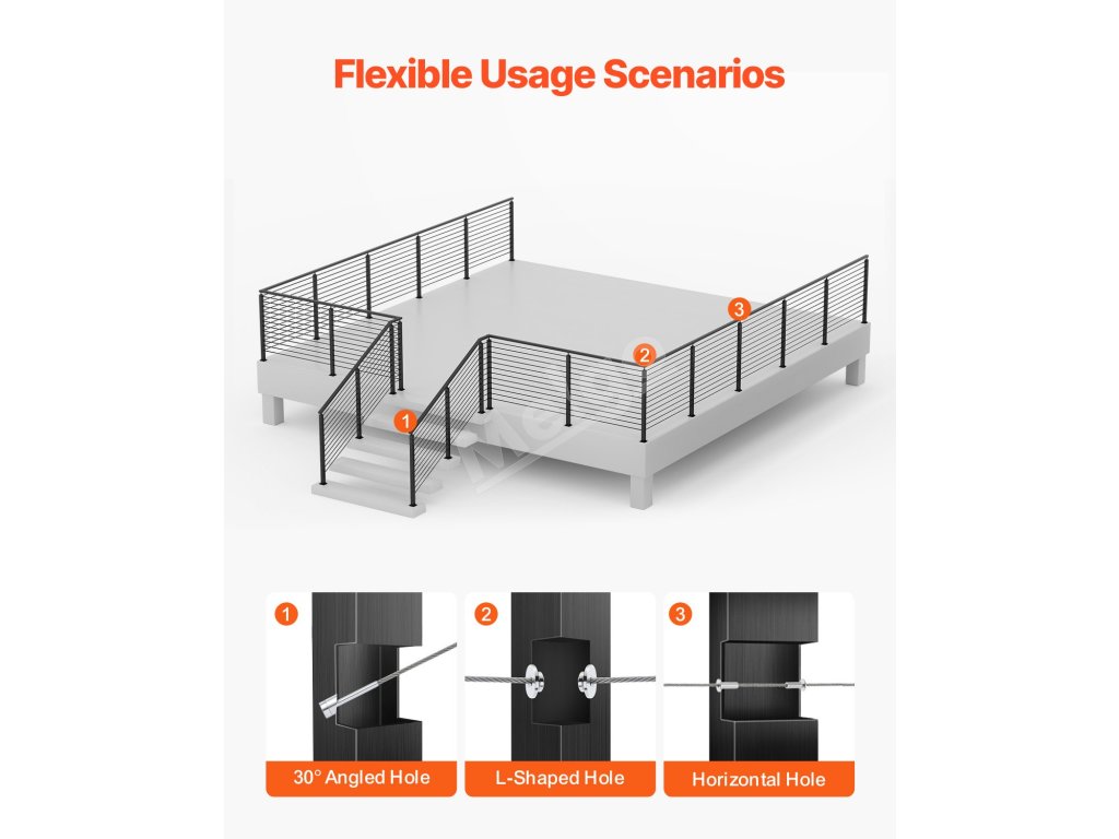 Naša súprava káblového zábradlia obsahuje ploché aj zakrivené podpery, kompatibilné so štvorcovými a okrúhlymi rúrkovými zábradliami, čo umožňuje prispôsobenie uhlov zábradlia vlastným potrebám (otvory typu L podporujú len jednosmerné prispôsobenie uhla zábradlia).