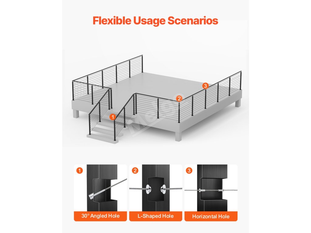 Objavte nový štandard stĺpikov zábradlia! Náš stĺpik zábradlia s káblami je vyrobený z odolnej nehrdzavejúcej ocele SUS304 a ponúka pevnosť aj štýl. Jednoducho sa inštaluje vďaka predvŕtaným otvorom a priloženému príslušenstvu a je ideálny na zabezpečenie paluby, zábradlia a ďalších prvkov, pričom spĺňa všetky požiadavky predpisov.