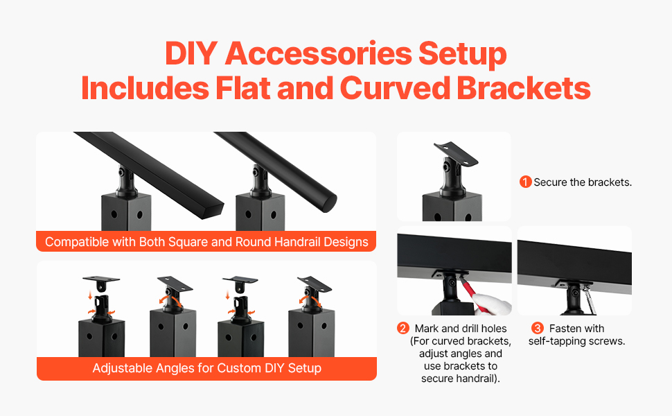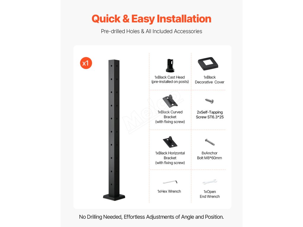 Toto schodiskové zábradlie sa dodáva s predvŕtanými otvormi, vďaka čomu nie je potrebné dodatočné vŕtanie. Umožňuje jednoduché nastavenie uhla a polohy počas inštalácie a obsahuje všetko potrebné príslušenstvo, čo šetrí prácu.