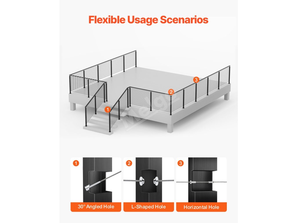Naša súprava káblového zábradlia obsahuje vodorovné a zakrivené podpery, ktoré sú kompatibilné so zábradlím zo štvorcových a okrúhlych rúrok. Umožňuje vytvoriť si uhly zábradlia na mieru podľa vlastného uváženia.