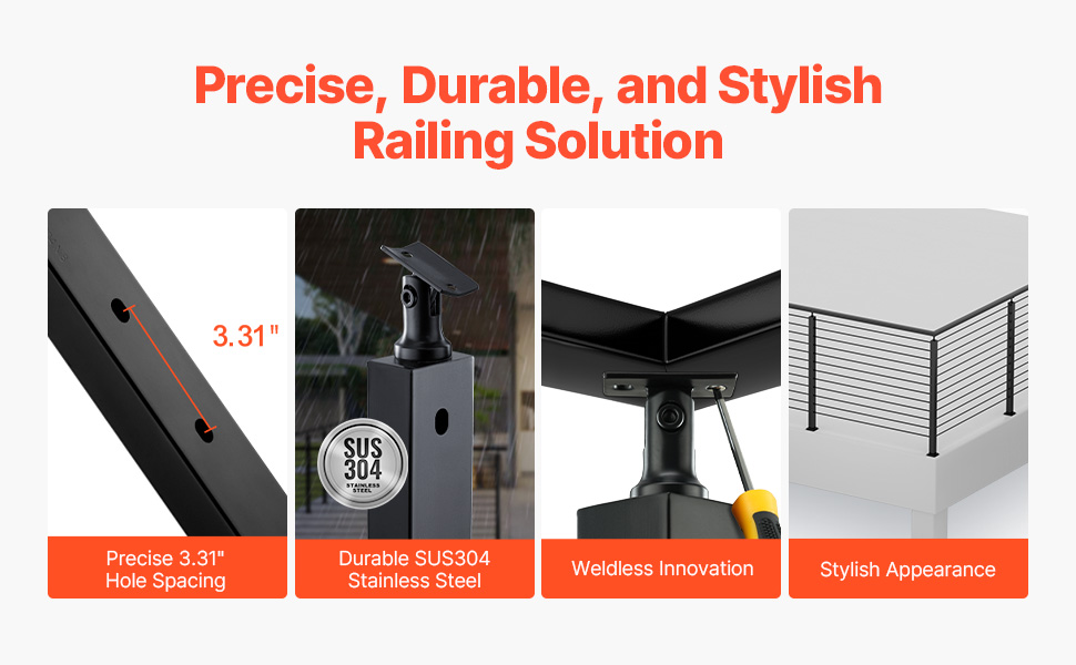 Náš systém káblového zábradlia je vyrobený z vysokokvalitnej nehrdzavejúcej ocele SUS304 a vyznačuje sa 3" rozstupmi otvorov, ktoré sú v súlade so stavebnými predpismi. Je nezváraný s čiernou povrchovou úpravou, vďaka čomu je štýlový a univerzálny pre rôzne nastavenia.