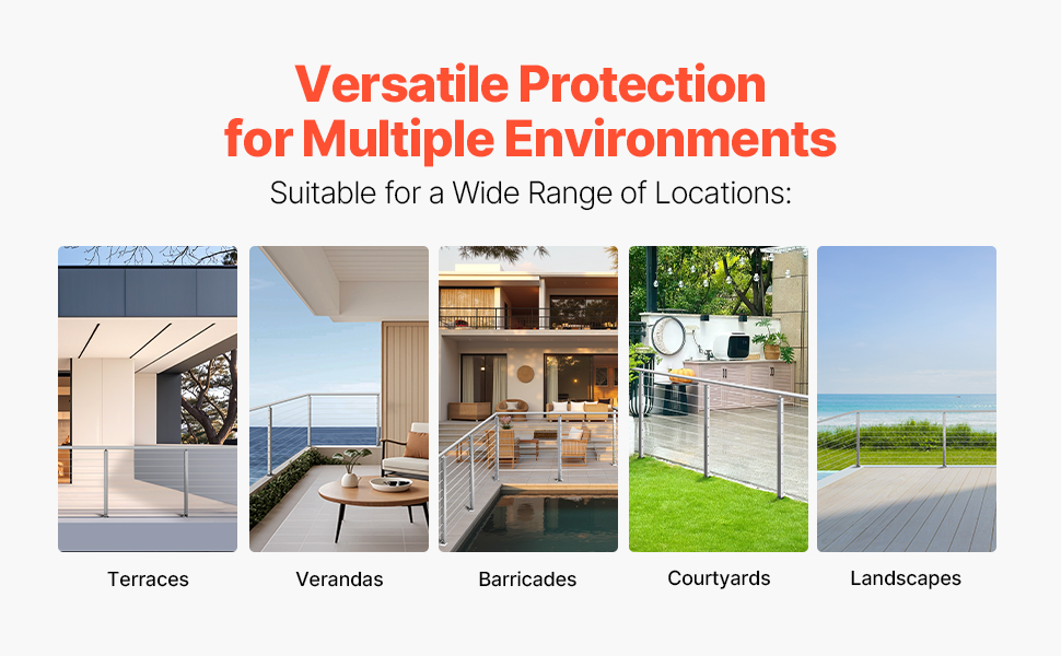 Táto súprava zábradlia je vhodná na vnútorné aj vonkajšie ochranné aplikácie, ako sú paluby, schody, verandy, ploty, terasy, balkóny, záhrady, obytné budovy, komerčné kancelárie, hotely, garáže a ďalšie.
