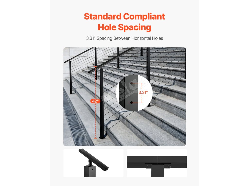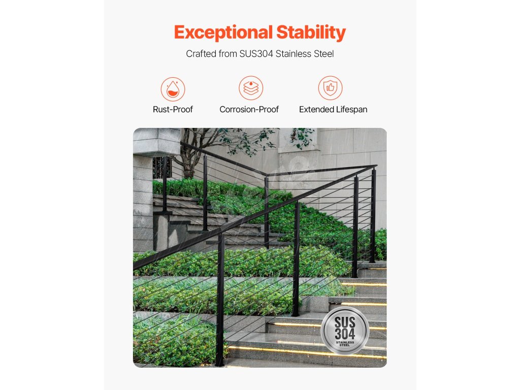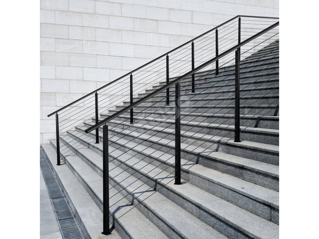 Náš systém káblového zábradlia je vyrobený z vysokokvalitnej nehrdzavejúcej ocele SUS304 a vyznačuje sa 3" rozstupmi otvorov, ktoré sú v súlade so stavebnými predpismi. Je nezváraný s čiernou povrchovou úpravou, vďaka čomu je štýlový a univerzálny pre rôzne nastavenia.