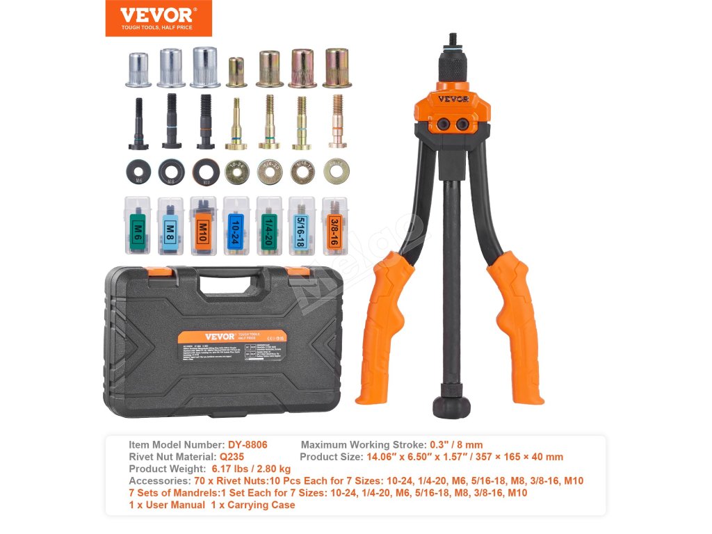 Nástroj na nitovacie matice 35.6 cm, 7 nástavcov metr. a SAE, 70 ks