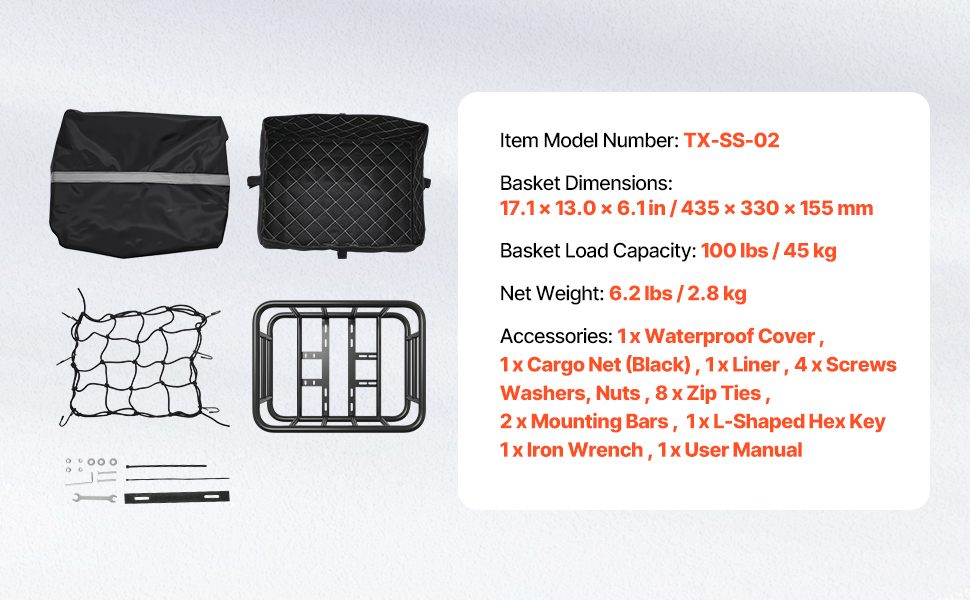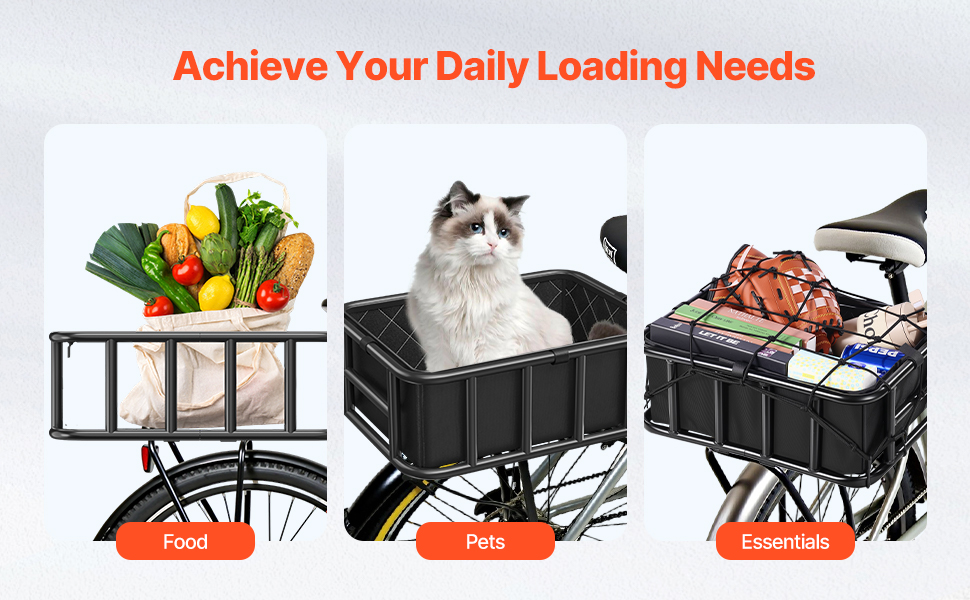 Tento štýlový zadný košík na bicykel dopĺňa váš bicykel. S nosnosťou 110 libier (45 kg) je ideálny na potraviny, domáce zvieratá alebo batožinu. Tento košík na bicykel je vyrobený z odolného kovu s povrchovou úpravou odolnou proti korózii, ľahko sa inštaluje, čistí a je ideálny na každodenné používanie.